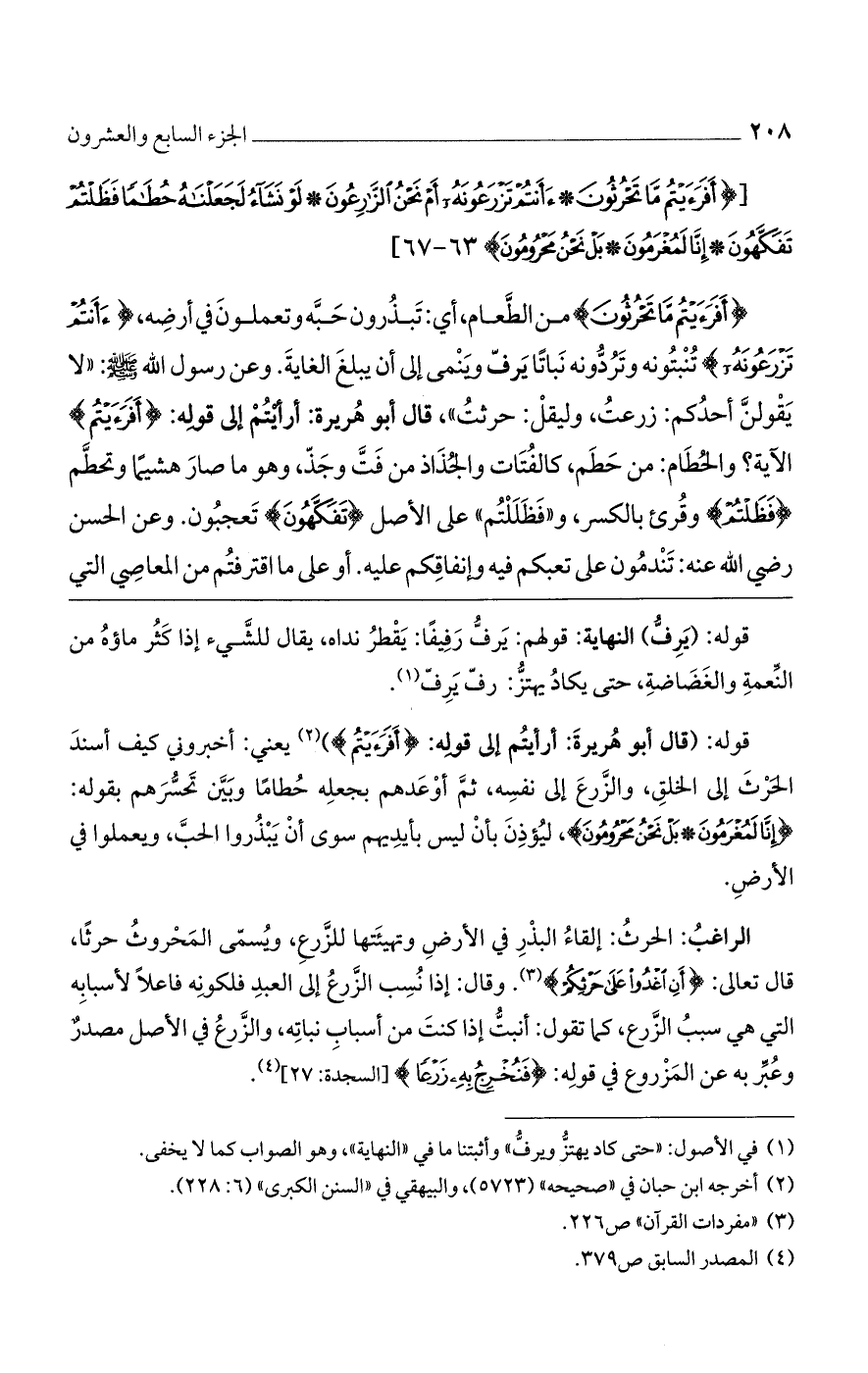 {أَفَرَأَيْتُم مَّا تَحْرُثُونَ} من الطعام، أي: تبدون حبه وتعملون في أرضه، {أَأَنتُمْ تَزْرَعُونَهُ} تنبوته وتردونه نباتا يرف وينمى إلى أن يبلغ الغاية. وعن رسول الله صلى الله عليه وسلم: "لا يقولن أحدكم: زرعت، وليقل: حرثت"، قال أبو هريرة: أريتم إلى قوله {أَفَرَأَيْتُم} الآية؟ والحطام: من حطم، كالفتات والجذاذ من فت وجذ، وهو ما صار هشيما وتحطم {فَظَلْتُمْ} وقرئ بالكسر، و"فظللتم" على الأصل {تَفَكَّهُونَ} تعجبون. وعن الحسن رضي الله عنه: تندمون على تعبكم فيه وإنفاقكم عليه. أو على ما اقترفتم من المعاصي التي