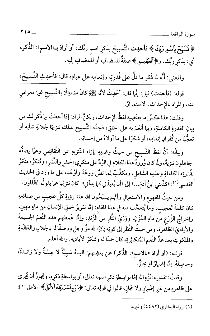 {فَسَبِّحْ بِاسْمِ رَبِّكَ} فأحدث التسبيح بذكر اسم ربك، أو أراد ب"الاسم": الذكر، أي: بذكر ربك. و {العَظِيمِ} صفة للمضاف أو للمضاف إليه.
