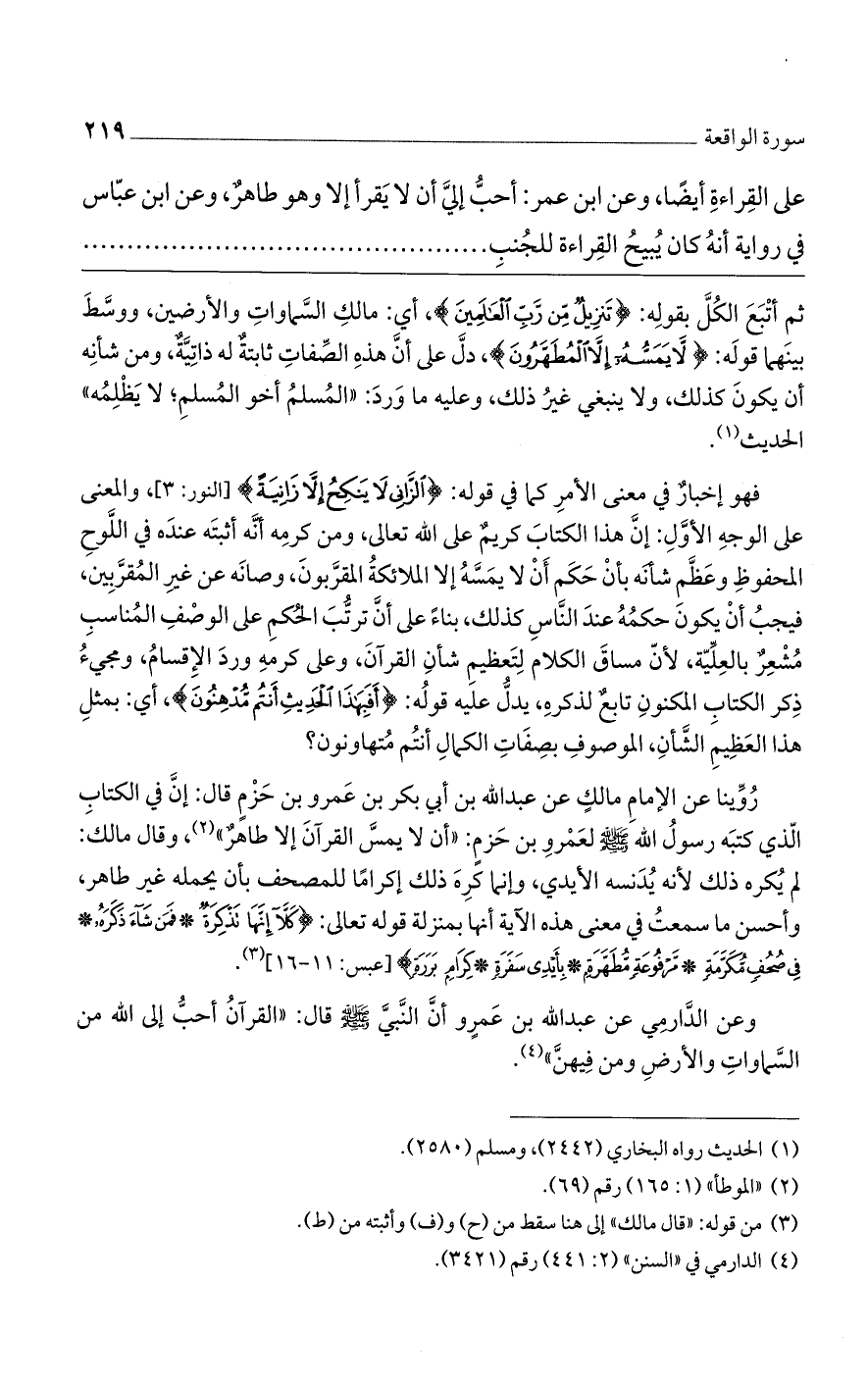 روينا عن الإمام مالك عن عبد الله بن أبي بكر بن عمرو بن حزم: "أن لا يمس القرآن إلا طاهر"، وقال مالك: لم يكره ذلك لأنه يدنسه الأيدي، وإنما كره ذلك إكرامًا للمصحف بأن يحمله غير طاهر، وأحسن ما سمعت في معنى هذه الآية أنها بمنزلة قوله تعالى: {كَلَّا إِنَّهَا تَذْكِرَةٌ * فَمَنْ شَاءَ ذَكَرَهُ * فِي صُحُفٍ مُكَرَّمَةٍ * مَرْفُوعَةٍ مُطَهَّرَةٍ * بِأَيْدِي سَفَرَةٍ * كِرَامٍ بَرَرَةٍ} [عبس: 11 - 16].