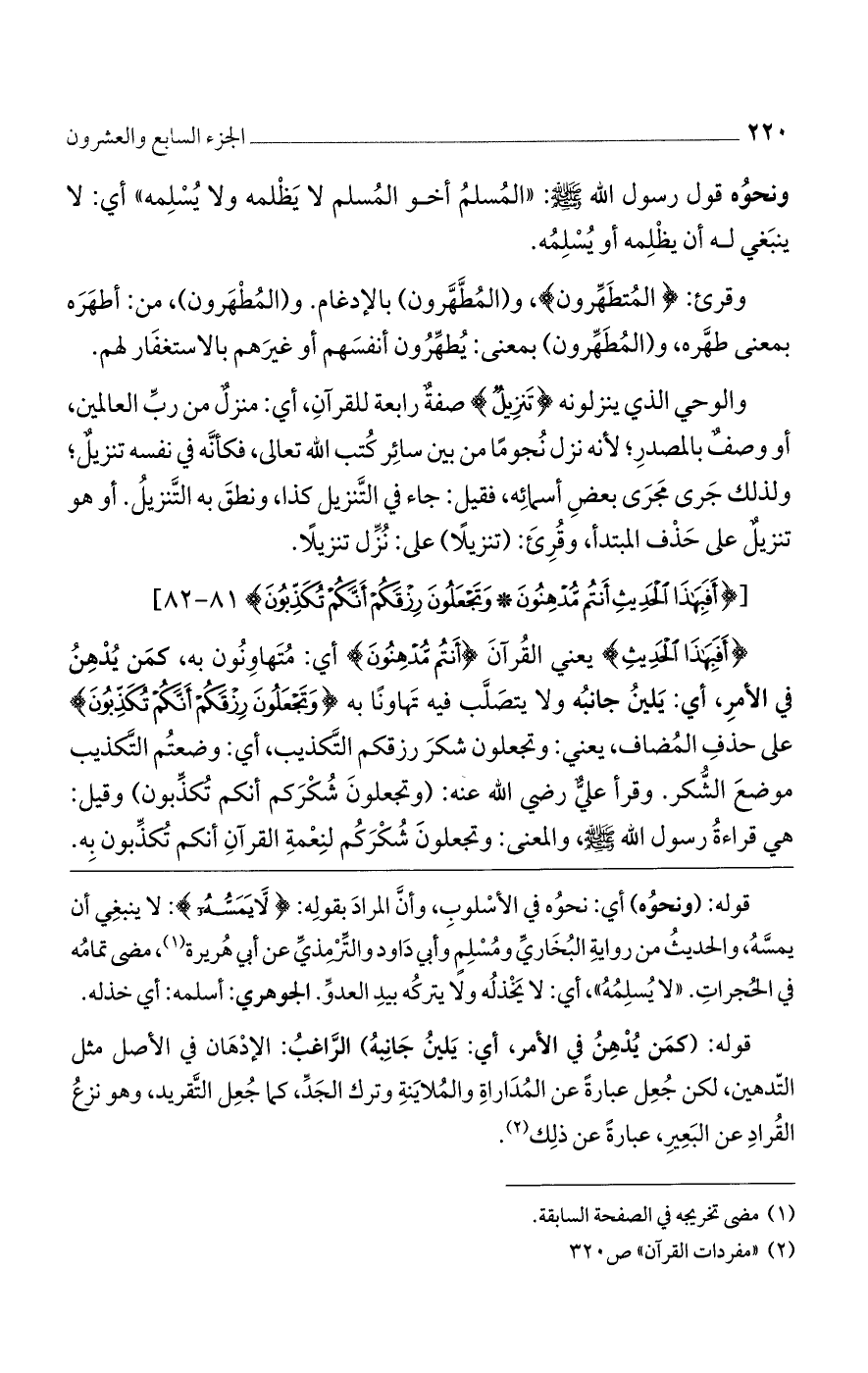 قوله: (ونحوه) أي: نحوه في الأسلوب، وأن المراد بقوله: {لَا يَمَسُّهُ}: لا ينبغي أن يمسه، والحديث من رواية البخاري ومسلم وأبي داود والترمذي عن أبي هريرة، مضى تمامه في الحجرات. "لا يسلمه"، أي: لا يخذله ولا يتركه بيد العدو. الجوهري: أسلمه: أي خذله.