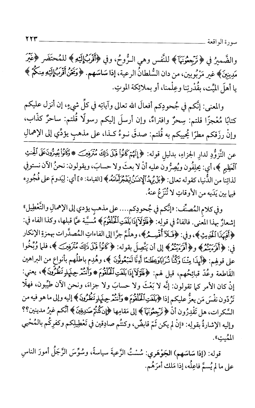 وفي كلام المصنف: "إنكم في جحودكم .... على مذهب يؤدي إلى الإهمال والتعطيل" أشعار بهذا المعنى. فالفاء في قوله: {فَلَوْلا إذَا بَلَغَتِ الحُلْقُومَ} مسببة عما قبلها، وكذا الفاء في: {أَفَبِهَذَا الحَدِيثِ}، وفي: {فَلا أُقْسِمُ}، وهلم جرا إلى الفاءات المصدرات بهمزة الإنكار في: {أَفَرَأَيْتُم} و {أَفَرَأَيْتُم} إلى أن يتصل بقوله: {كَانُوا قَبْلَ ذَلِكَ مُتْرَفِينَ}، فلما وبخوا على قولهم: {أَئِذَا مِتْنَا وكُنَّا تُرَابًا وعِظَامًا أَئِنَّا لَمَبْعُوثُونَ}، وهدم باطلهم بأنواع من البراهين القاطعة وعد قبائحهم، قيل لهم: {فَلَوْلا إذَا بَلَغَتِ الحُلْقُومَ * وأَنتُمْ حِينَئِذٍ تَنظُرُونَ}، يعني: إن كان الأمر كما تقولون: إنه لا بعث ولا حساب ولا جزاء، ونحن الآن طيبون، فهلا تردون نفس من يعز عليكم إذا {بَلَغَتِ الحُلْقُومَ * وأَنتُمْ حِينَئِذٍ تَنظُرُونَ} إليه وإلى ما هو فيه من السكرات، هل تقدرون أن {تَرْجِعُونَهَا} إلى مقامها {إن كُنتُمْ صَادِقِينَ} أنكم غير مدينين؟ ؟ وإليه الإشارة بقوله: "إن لم يكن ثم قابض، وكنتم صادقين في تعطيلكم وكفركم بالمحيي المميت".