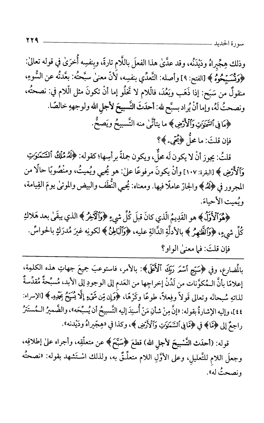 وذلك هجيراه وديدنه، وقد عدى هذا الفعل باللام تارةً، وبنفسه أخرى في قوله تعالى: {وَتُسَبِّحُوهُ} [الفتح: 9] وأصله: التعدي بنفسه، لأن معنى سبحته: بعدته عن السوء، منقول من سبح: إذا ذهب وبعد، فاللام لا تخلو إما أن تكون مثل اللام في: نصحته، ونصحت له، وإما أن يراد بسبح لله: أحدث التسبيح لأجل الله ولوجهه خالصًا.