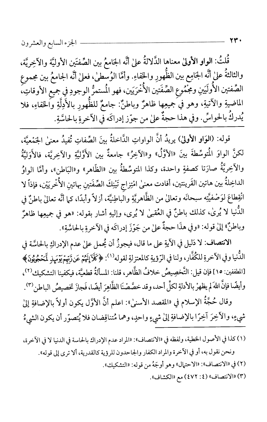 قلت: الواو الأولى معناها الدلالة على أنه الجامع بين الصفتين الأولية والآخرية، والثالثة على أنه الجامع بين الظهور والخفاء. وأما الوسطى، فعلى أنه الجامع بين مجموع الصفتين الأوليين ومجموع الصفتين الأخريين، فهو المستمر الوجود في جميع الأوقات، الماضية والآتية، وهو في جميعها ظاهر وباطن: جامع للظهور بالأدلة والخفاء، فلا يدرك بالحواس. وفي هذا حجة على من جوز إدراكه في الآخرة بالحاسة.