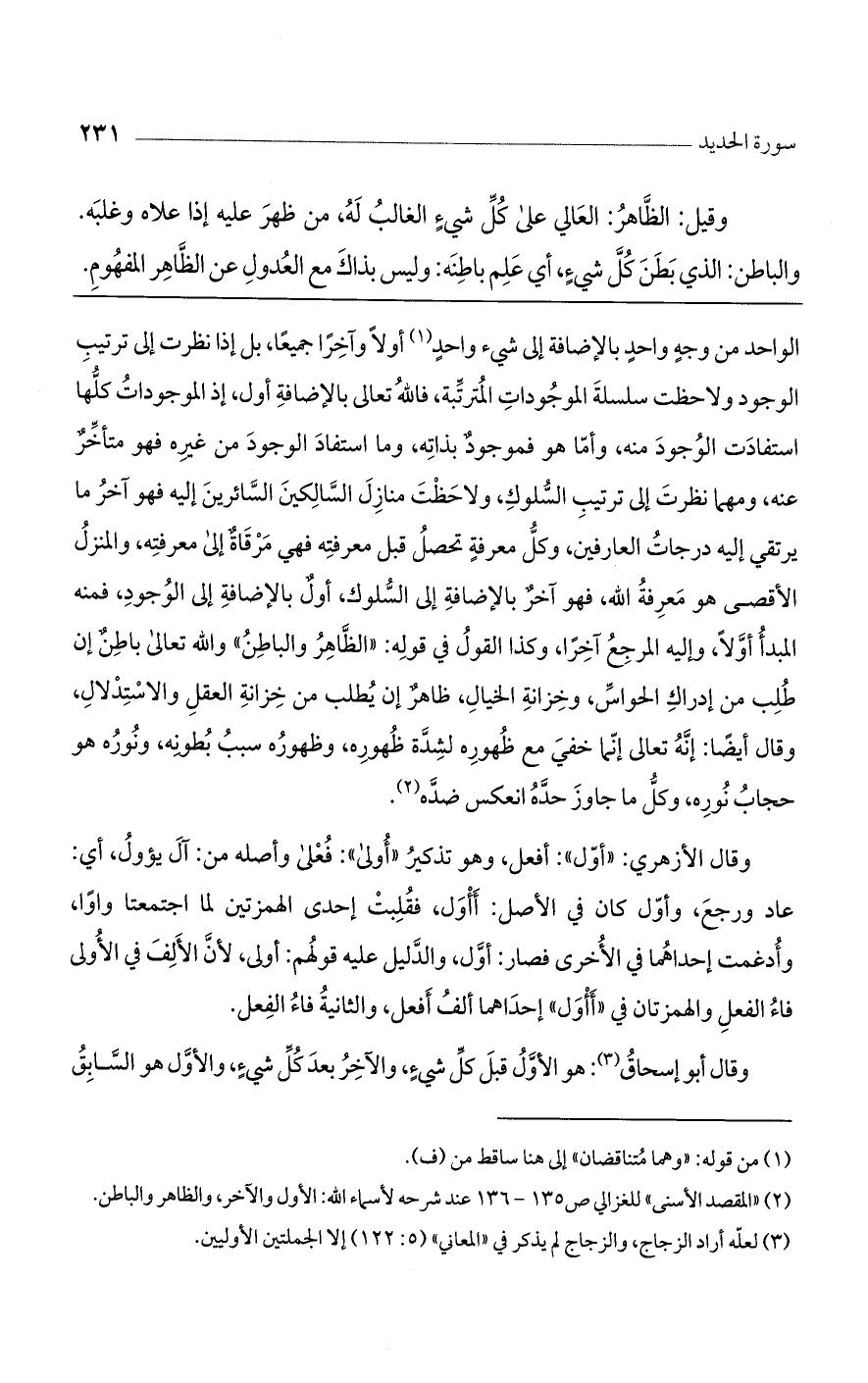 الواحد من وجه واحد بالإضافة إلى شيء واحد أولًا وآخرًا جميعًا، بل إذا نظرت إلى ترتيب الوجود ولاحظت سلسلة الموجودات المترتبة، فالله تعالى بالإضافة أول، إذ الموجودات كلها استفادت الوجود منه، وأما فو فموجود بذاته، وما استفاد الوجود من غيره فهو متأخر عنه، ومهما نظرت إلى ترتيب السلوك، ولاحظت منازل السالكين السائرين إليه فهو آخر ما يرتقي إليه درجات العارفين، وكل معرفة تحصل قبل معرفته فهي مرقاة إلى معرفته، والمنزل الأقصى هو معرفة الله، فهو آخر بالإضافة إلى السلوك، أول بالإضافة إلى الوجود، فمنه المبدأ أولًا، وإليه المرجع آخرًا، وكذا القول في قوله: "الظاهر والباطن" والله تعالى باطن إن طلب من إدراك الحواس، وخزانة الخيال، ظاهر إن يطلب من خزانة العقل والاستدلال، وقال أيضًا: إنه تعالى إنما خفي مع ظهوره لشدة ظهوره، وظهوره سبب بطونه، ونوره هو حجاب نوره، وكل ما جاوز حده انعكس ضده.