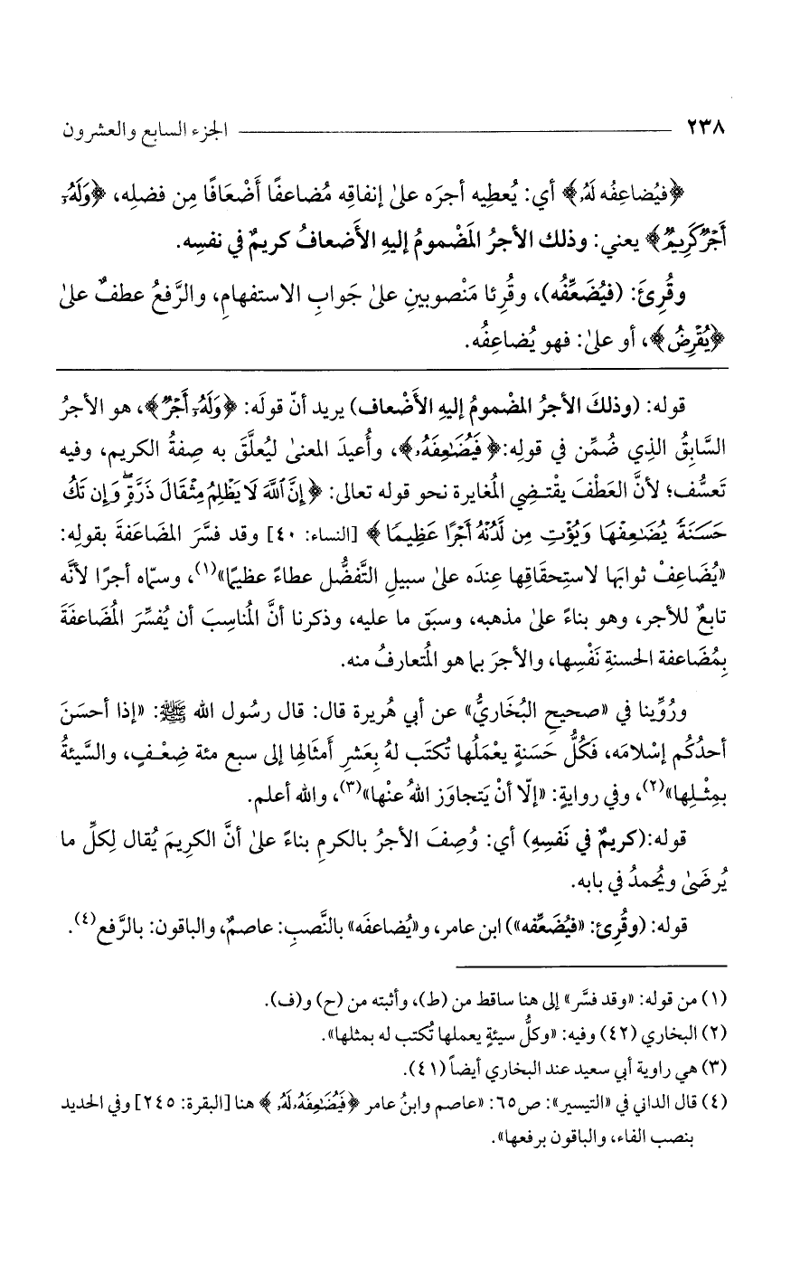 قوله: (وذلك الأجر المضموم إليه الأ ضعاف) يريد أن قوله: {ولَهُ أَجْرٌ}، هو الأجر السابق الذي ضمن في قوله: {فَيُضَاعِفَهُ}، وأعيد المعنى ليعلق به صفة الكريم، وفيه تعسف؛ لأن العطف يقتضي المغايرة نحو قوله تعالى: {إِنَّ اللَّهَ لَا يَظْلِمُ مِثْقَالَ ذَرَّةٍ وَإِنْ تَكُ حَسَنَةً يُضَاعِفْهَا وَيُؤْتِ مِنْ لَدُنْهُ أَجْرًا عَظِيمًا} [النساء: 40] وقد فسر المضاعفة بقوله: "يضاعف ثوابها لاستحقاقها عنده على سبيل التفضل عطاءً عظيمًا"، وسماه أجرًا لأنه تابع للأجر، وهو بناء على مذهبه، وسبق ما عليه، وذكرنا أن المناسب أن يفسر المضاعفة بمضاعفة الحسنة نفسها، والأجر بما هو المتعارف.