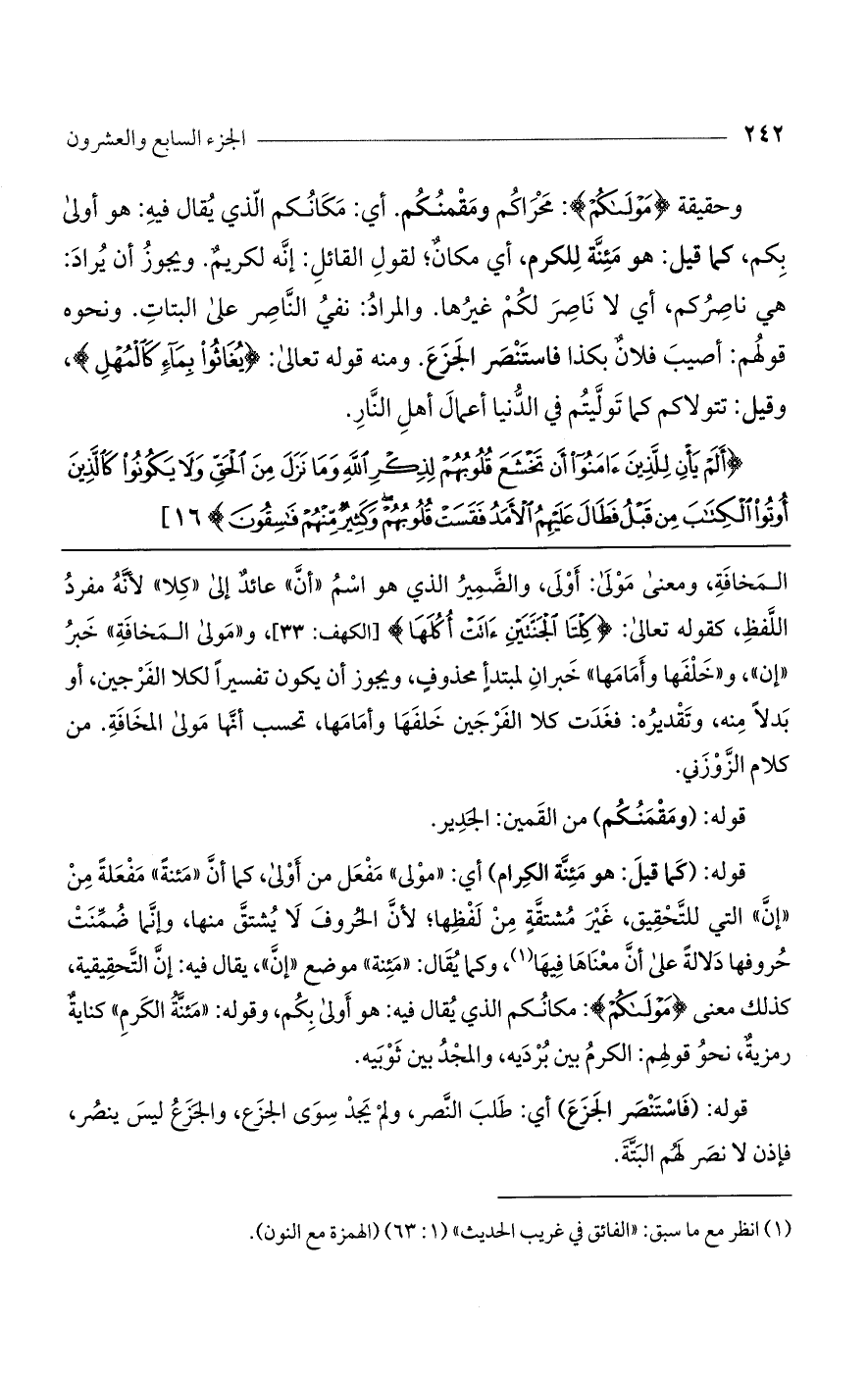 وحقيقة {مَوْلاكُمْ}: محراكم ومقمنكم. أي: مكانكم الذي يقال فيه: هو أولى بكم، كما قيل: هو مئنة للكرم، أي مكان؛ لقول القائل: إنه لكريم. ويجوز أن يراد: هي ناصركم، أي لا ناصر لكم غيرها. والمراد: نفي الناصر على البتات. ونحوه قولهم: أصيب فلان بكذا فاستنصر الجزع. ومنه قوله تعالى: {يُغَاثُوا بِمَاءٍ كَالْمُهْلِ}، وقيل: تتولاكم كما توليتم في الدنيا أعمال أهل النار.
