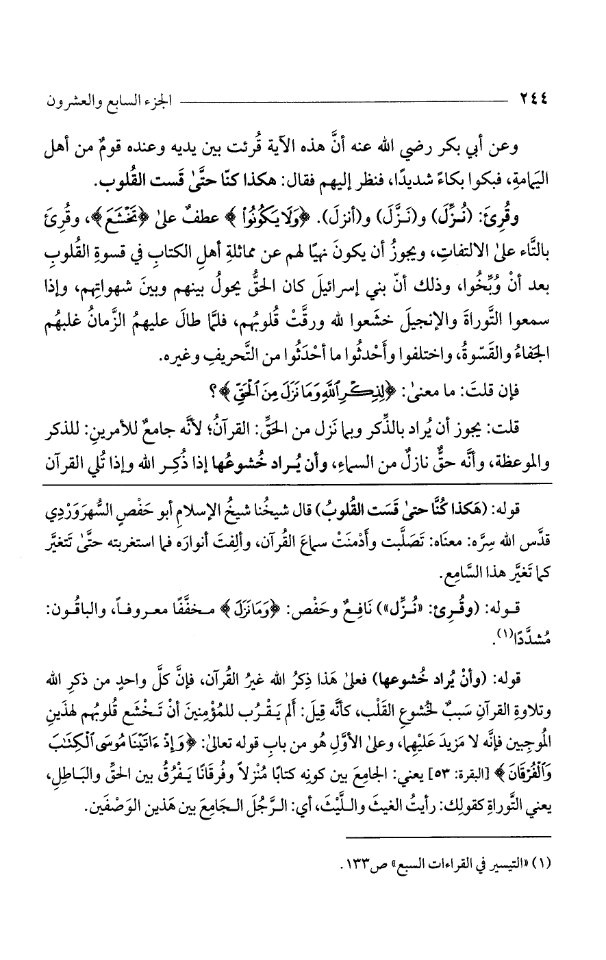 وعن أبي بكر رضي الله عنه أن هذه الآية قرئت بين يديه وعنده قوم من أهل اليمامة، فبكوا بكاء شديدًا، فنظر إليهم فقال: هكذا كنا حتى قست القلوب.