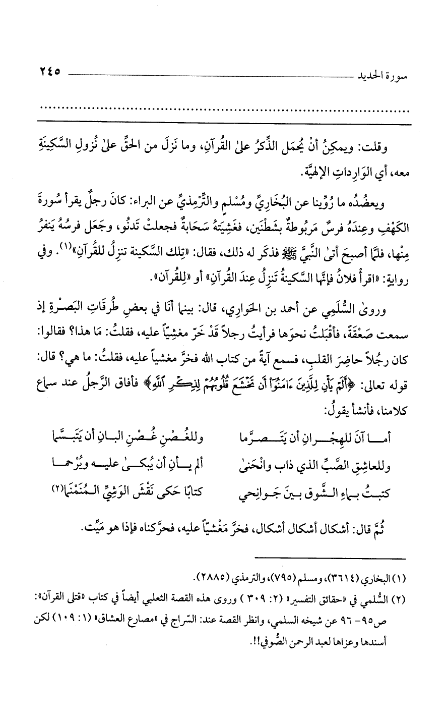 وروى السلمي عن أحمد بن الحواري، قال: بينما أنا في بعض طرقات البصرة إذ سمعت صعقة، فأقبلت نحوها فرأيت رجلًا مغشيًا عليه، فقلت: ما هذا؟ فقالوا: كان رجلًا حاضر القلب، فسمع آية من كتاب الله فخر مغشيًا عليه، فقلت: ما هي؟ قال: قوله تعالى: {أَلَمْ يَانِ لِلَّذِينَ آمَنُوا أَن تَخْشَعَ قُلُوبُهُمْ لِذِكْرِ اللَّهِ} فأفاق الرجل عند سماع كلامنا، فأنشأ يقول: