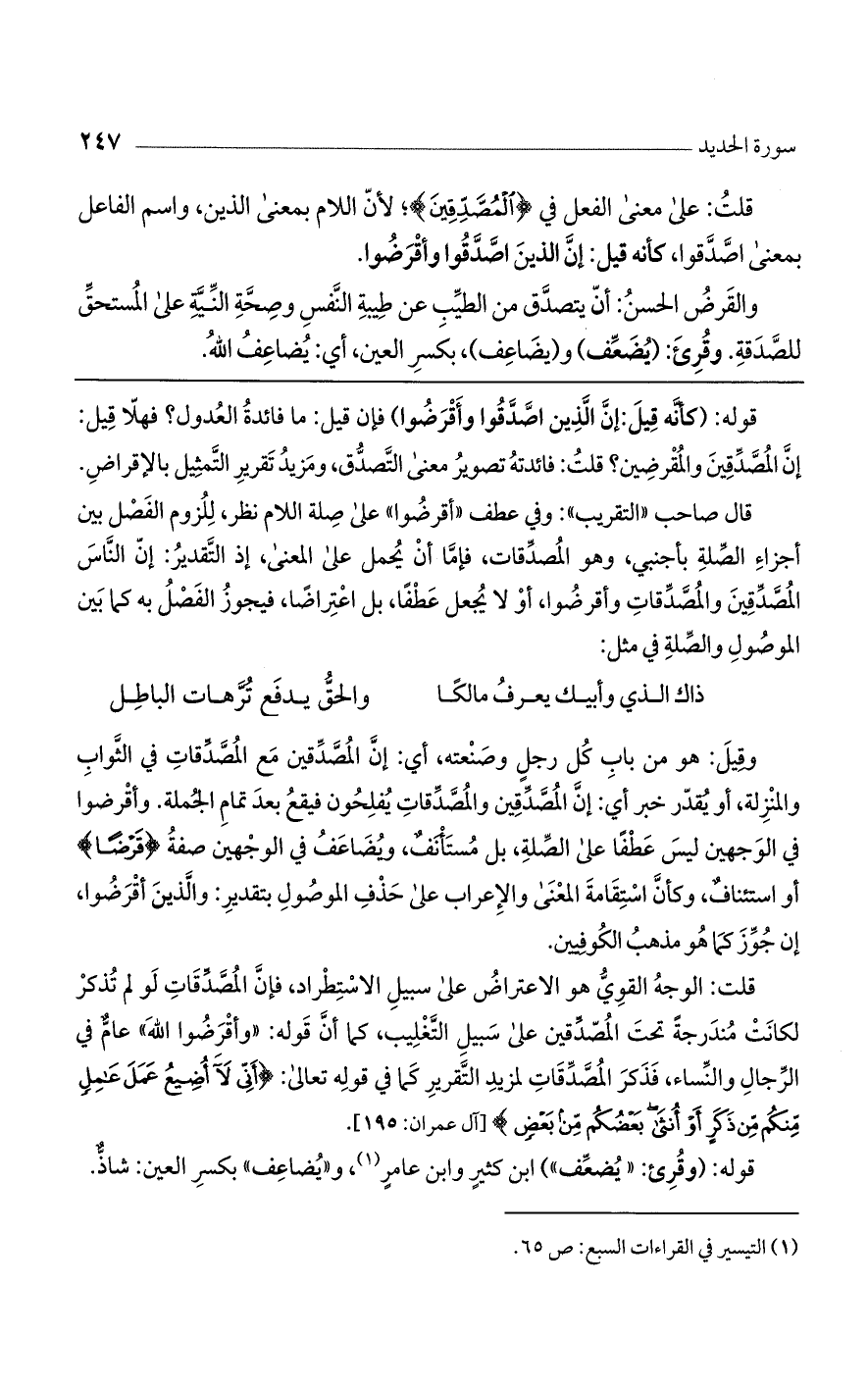 قلت: الوجه القوي هو الاعتراض على سبيل الاستطراد، فإن المصدقات لو لم تذكر لكانت مندرجة تحت المصدقين على سبيل التغليب، كما أن قوله: "وأقرضوا الله" عام في الرجال والنساء، فذكر المصدقات لمزيد التقرير كما في قوله تعالى: {أَنِّي لَا أُضِيعُ عَمَلَ عَامِلٍ مِنْكُمْ مِنْ ذَكَرٍ أَوْ أُنْثَى بَعْضُكُمْ مِنْ بَعْضٍ} [آل عمران: 195].