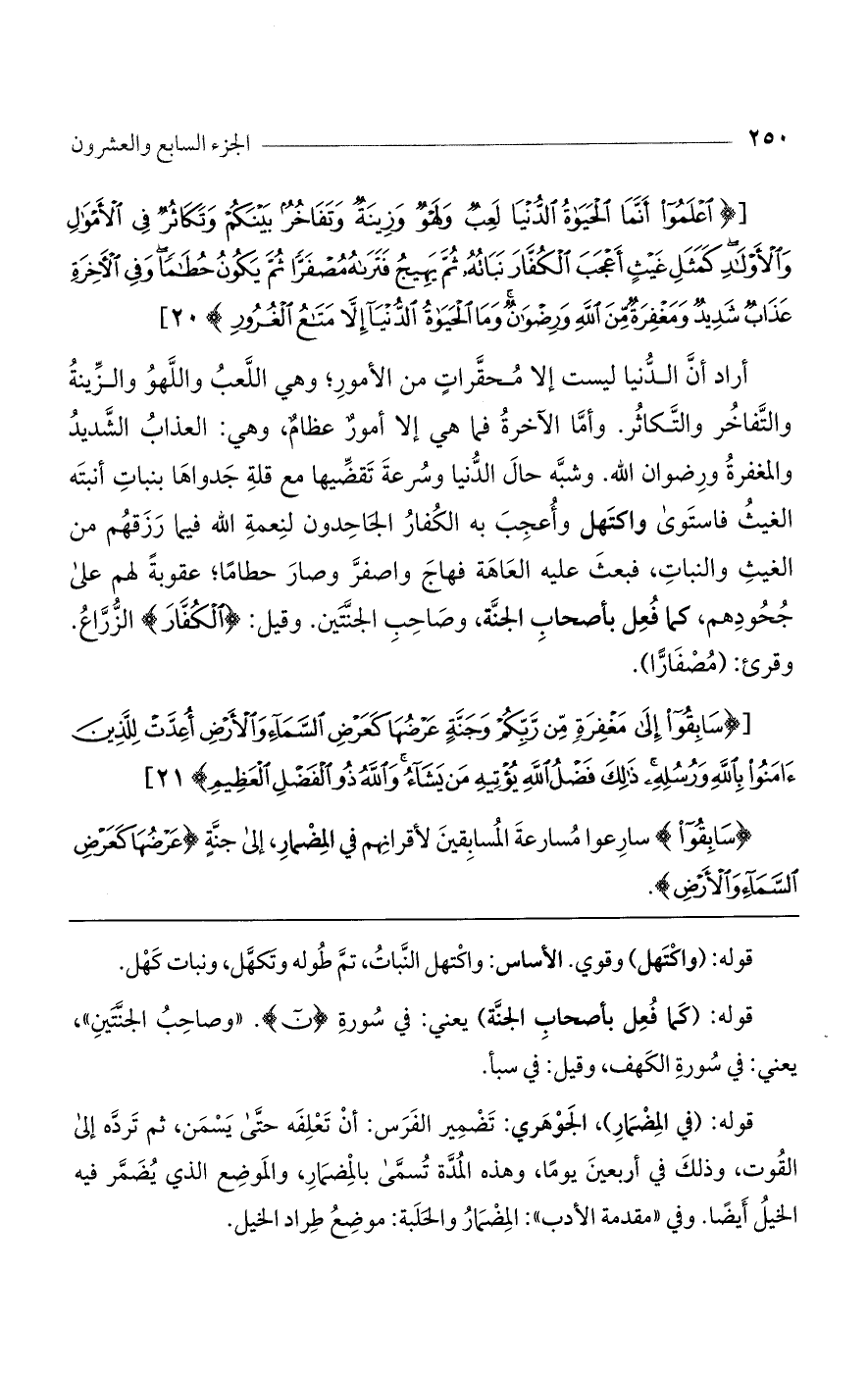 أراد أن الدنيا ليست إلا محقرات من الأمور؛ وهي اللعب واللهو والزينة والتفاخر والتكاثر. وأما الآخرة فما هي إلا أمور عظام، وهي: العذاب الشديد والمغفرة ورضوان الله. وشبه حال الدنيا وسرعة تقضيها مع قلة جدواها بنبات أنبته الغيث فاستوى واكتهل وأعجب به الكفار الجاحدون لنعمة الله فيما رزقهم من الغيث والنبات، فبعث عليه العاهة فهاج واصفر وصار حطامًا؛ عقوبةً لهم على جحودهم، كما فعل بأصحاب الجنة، وصاحب الجنتين. وقيل: {الكُفَّارَ} الزراع. وقرئ: (مصفارًا).