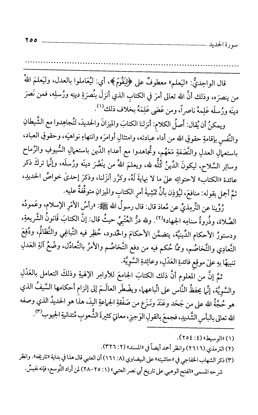 ثم إن من المعلوم أن ذلك الكتاب الجامع للأوامر الإلهية وذلك التعامل بالعدل والسوية، إنما يحفظ الناس عن اتباعهما، ويضطر العالم إلى إلزام أحكامها السيف الذي هو حجة الله على من جحد وعند نزع من صفقة الجماعة اليد، هذا هو الحديد الذي وصفه الله تعالى بالبأس الشديد، فجمع بالقول الوجيز، معاني كثيرة الشعوب متدانية الجيوب.