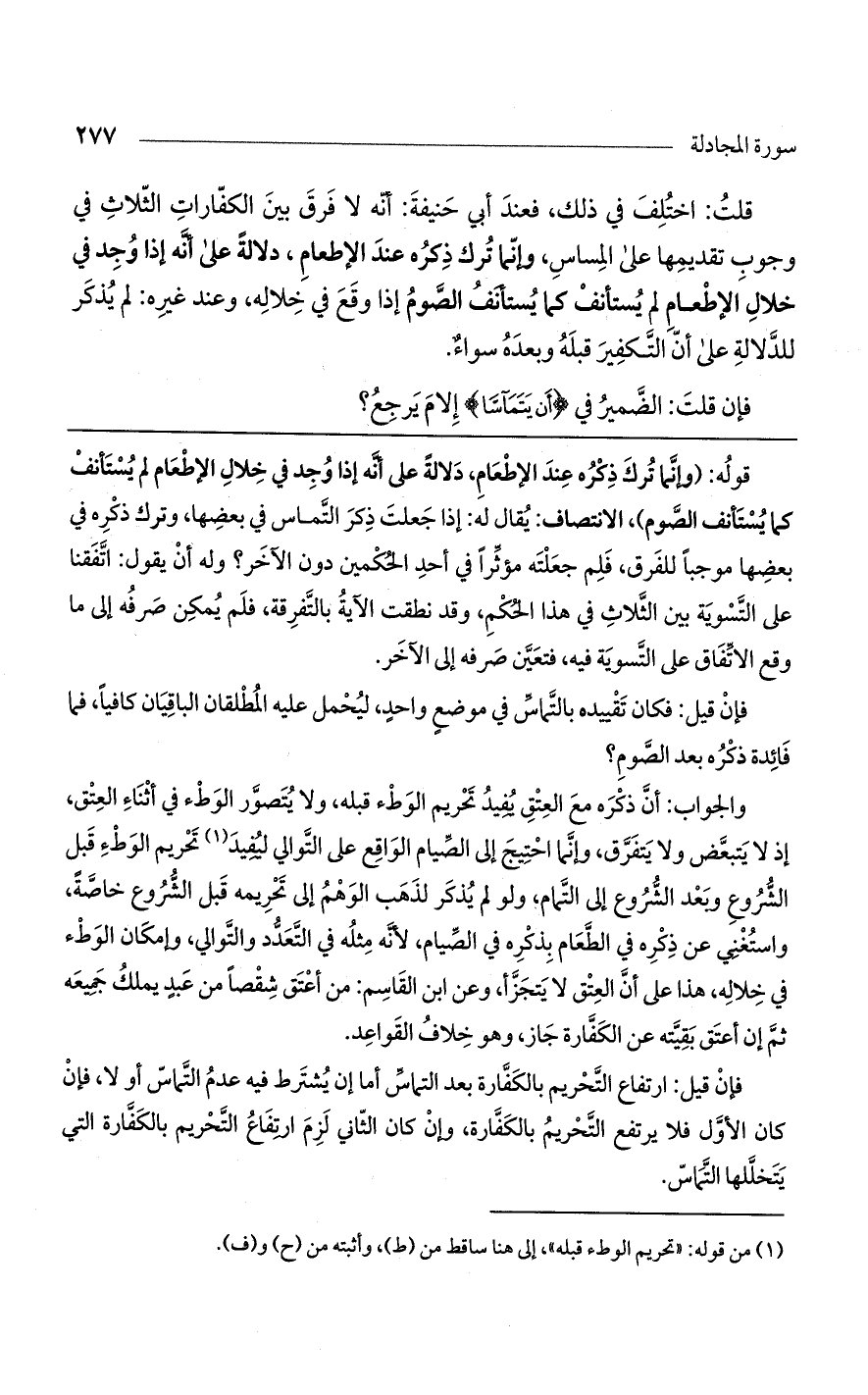 قوله: (وإنما ترك ذكره عند الإطعام، دلالة على أنه إذا وجد في خلال الإطعام يستأنف كما يستأنف الصوم)، الانتصاف: يقال له: إذا جعلت ذكر التماس في بعضها، وترك ذكره في بعضها موجبًا للفرق، فلم جعلته مؤثرًا في أحد الحكمين دون الآخر؟ وله أن يقول: اتفقنا على التسوية بين الثلاث في هذا الحكم، وقد نطقت الآية بالتفرقة، فلم يمكن صرفه إلى ما وقع الاتفاق على التسوية فيه، صرفه إلى الآخر.
