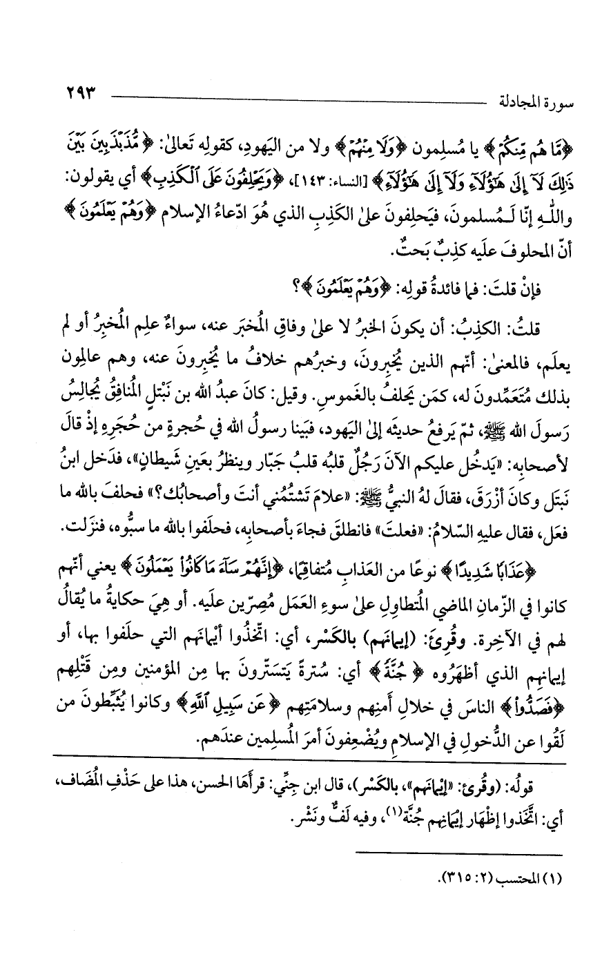 {مَّا هُم مِّنكُمْ} يا مسلمون {ولا مِنْهُمْ} ولا من اليهود، كقوله تعالى: {مُذَبْذَبِينَ بَيْنَ ذَلِكَ لَا إِلَى هَؤُلَاءِ وَلَا إِلَى هَؤُلَاءِ} [النساء: 143]، {ويَحْلِفُونَ عَلَى الكَذِبِ} أي يقولون: والله إنا لمسلمون، فيحلفون على الكذب الذي هو ادعاء الإسلام {وهُمْ يَعْلَمُونَ} أن المحلوف عليه كذب بحت.