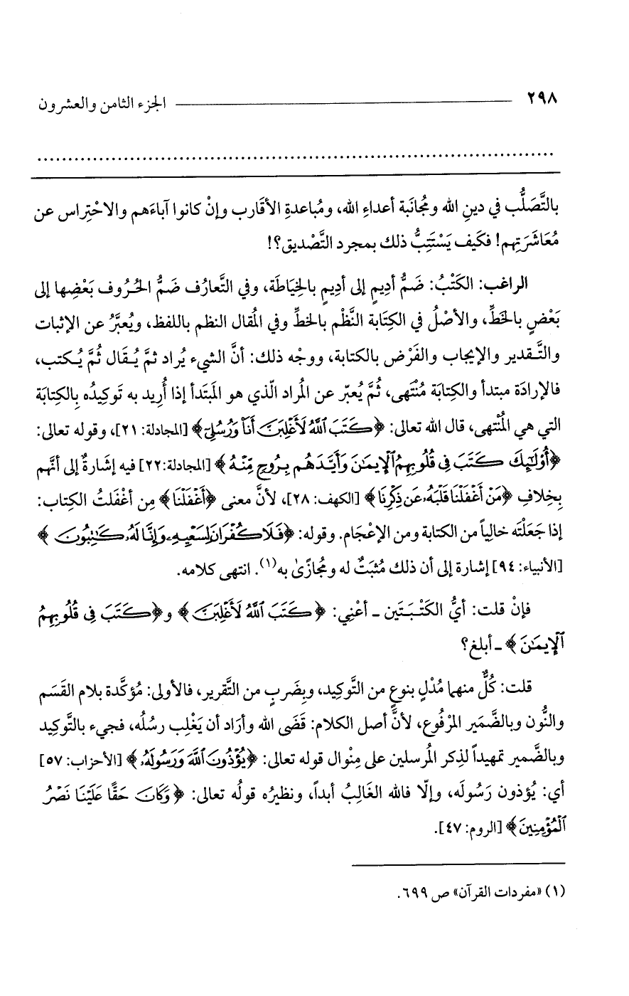 الراغب: الكتب: ضم أديم إلى أديم بالخياطة، وفي التعارف ضم الحروف بعضها إلى بعض بالخط، والأصل في الكتابة النظم بالخط وفي المقال النظم باللفظ، ويعبر عن الإثبات والتقدير والإيجاب والفرض بالكتابة، ووجه ذلك: أن الشيء يراد ثم يقال ثم يكتب، فالإرادة مبتدأ والكتابة منتهى، ثم يعبر عن المراد الذي هو المبتدأ إذا أريد به توكيده بالكتابة التي هي المنتهى، قال الله تعالى: {كَتَبَ اللَّهُ لأَغْلِبَنَّ أَنَا ورُسُلِي} [المجادلة: 21]، وقوله تعالى: {أُوْلَئِكَ كَتَبَ فِي قُلُوبِهِمُ الإيمَانَ وأَيَّدَهُم بِرُوحٍ مِّنْهُ} [المجادلة: 22] فيه إشارة إلى أنهم بخلاف {مَنْ أَغْفَلْنَا قَلْبَهُ عَنْ ذِكْرِنَا} [الكهف: 28]، لأن معنى {أَغْفَلْنَا} من أغفلت الكتاب: إذا جعلته خاليًا من الكتابة ومن الإعجام. وقوله: {فَلَا كُفْرَانَ لِسَعْيِهِ وَإِنَّا لَهُ كَاتِبُونَ} [الأنبياء: 94] إشارة إلى أن ذلك مثبت له ومجازى به. انتهى كلامه.