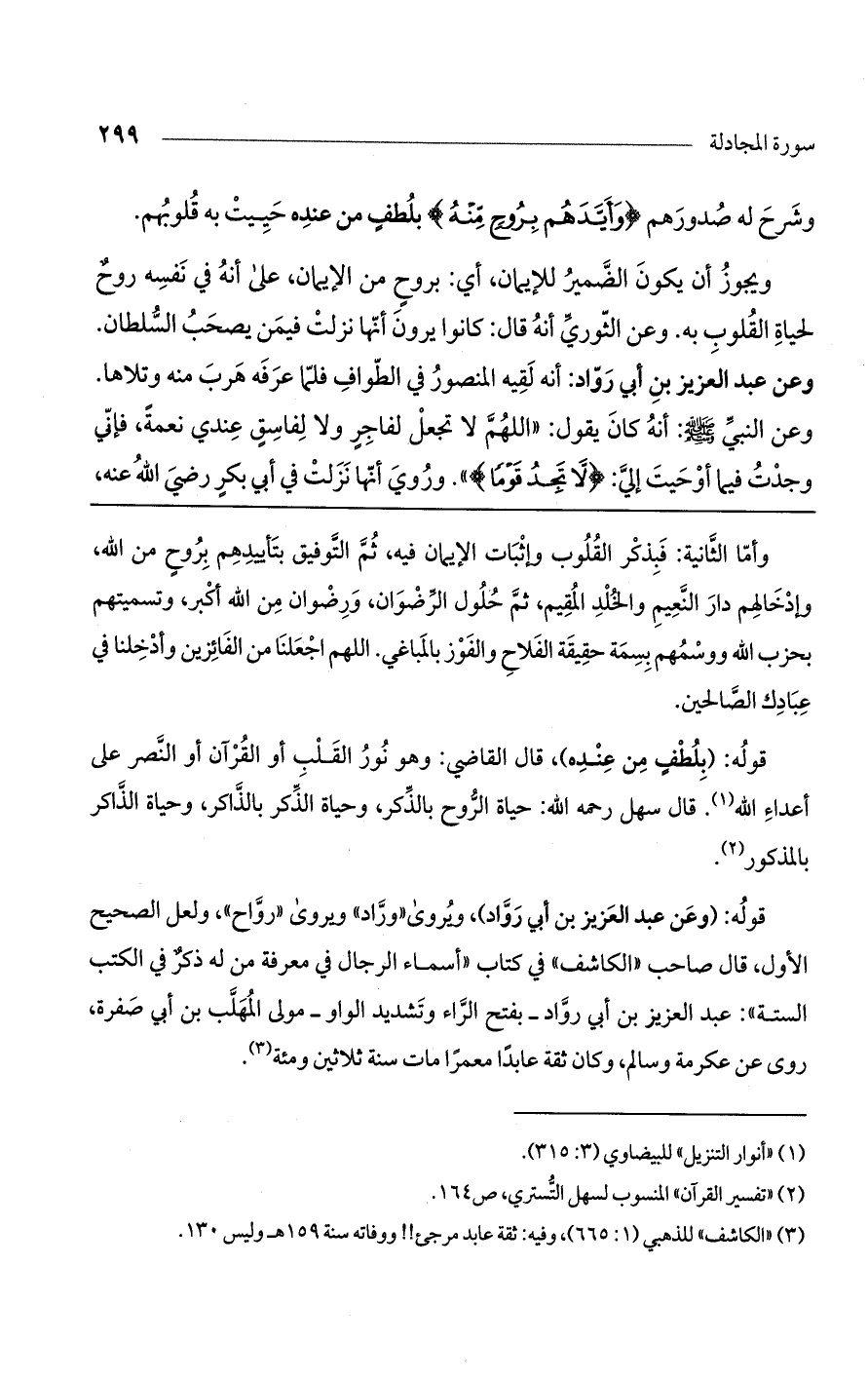 وأما الثانية: فبذكر القلوب وإثبات الإيمان فيه، ثم التوفيق بتأييدهم بروح من الله، وإدخالهم دار النعيم والخلد المقيم، ثم حلول الرضوان، ورضوان من الله أكبر، وتسميتهم بحزب الله ووسمهم بسمة حقيقة الفلاح والفوز بالمباغي. اللهم اجعلنا من الفائزين وأدخلنا في عبادك الصالحين.