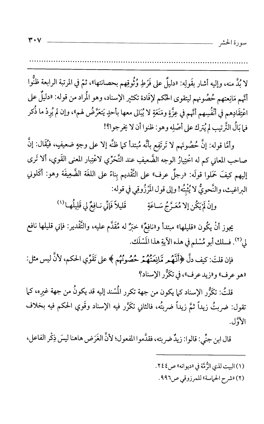 وأما قوله: إن حصونهم لا ترتفع بأنه مبتدأ كما ظنه إلا على وجه ضعيف، فيقال: إن صاحب المعاني كم له اختيار الوجه الضعيف عند التحري لاعتبار المعنى القوي، ألا ترى إليهم كيف حملوا قوله: "رجل عرف" على التقديم بناء على اللغة الضعيفة وهو: أكلوني البراغيث، والنحوي لا يبثه! وإلى قول المرزوقي في قوله: