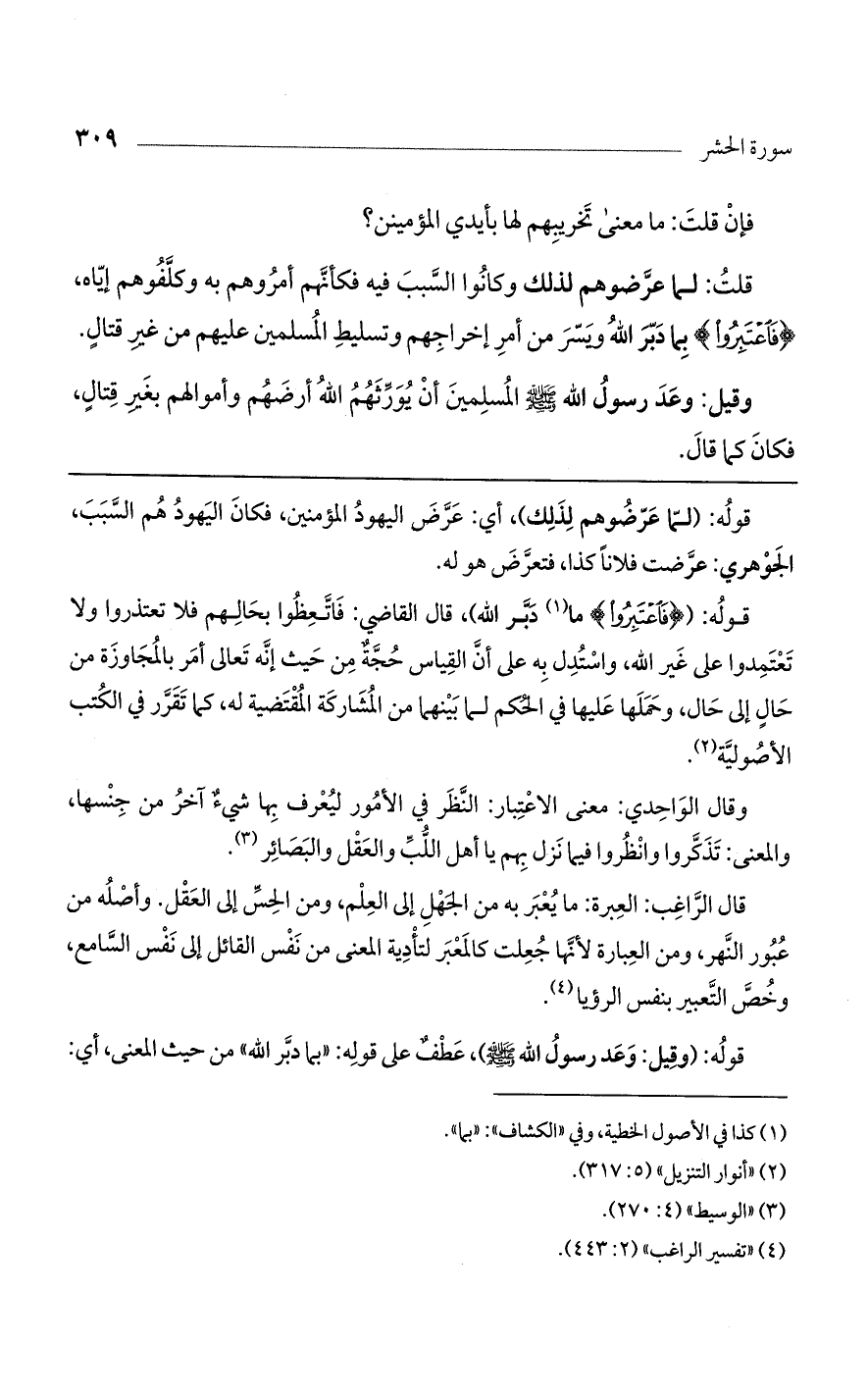 قوله: ({فَاعْتَبِرُوا} ما دبر الله)، قال القاضي: فاتعظوا بحالهم فلا تعتذروا ولا تعتمدوا على غير الله، واستدل به على أن القياس حجة من حيث إنه تعالى أمر بالمجاوزة من حال إلى حال، وحملها عليها في الحكم لما بينهما من المشاركة المقتضية له، كما تقرر في الكتب الأصولية.
