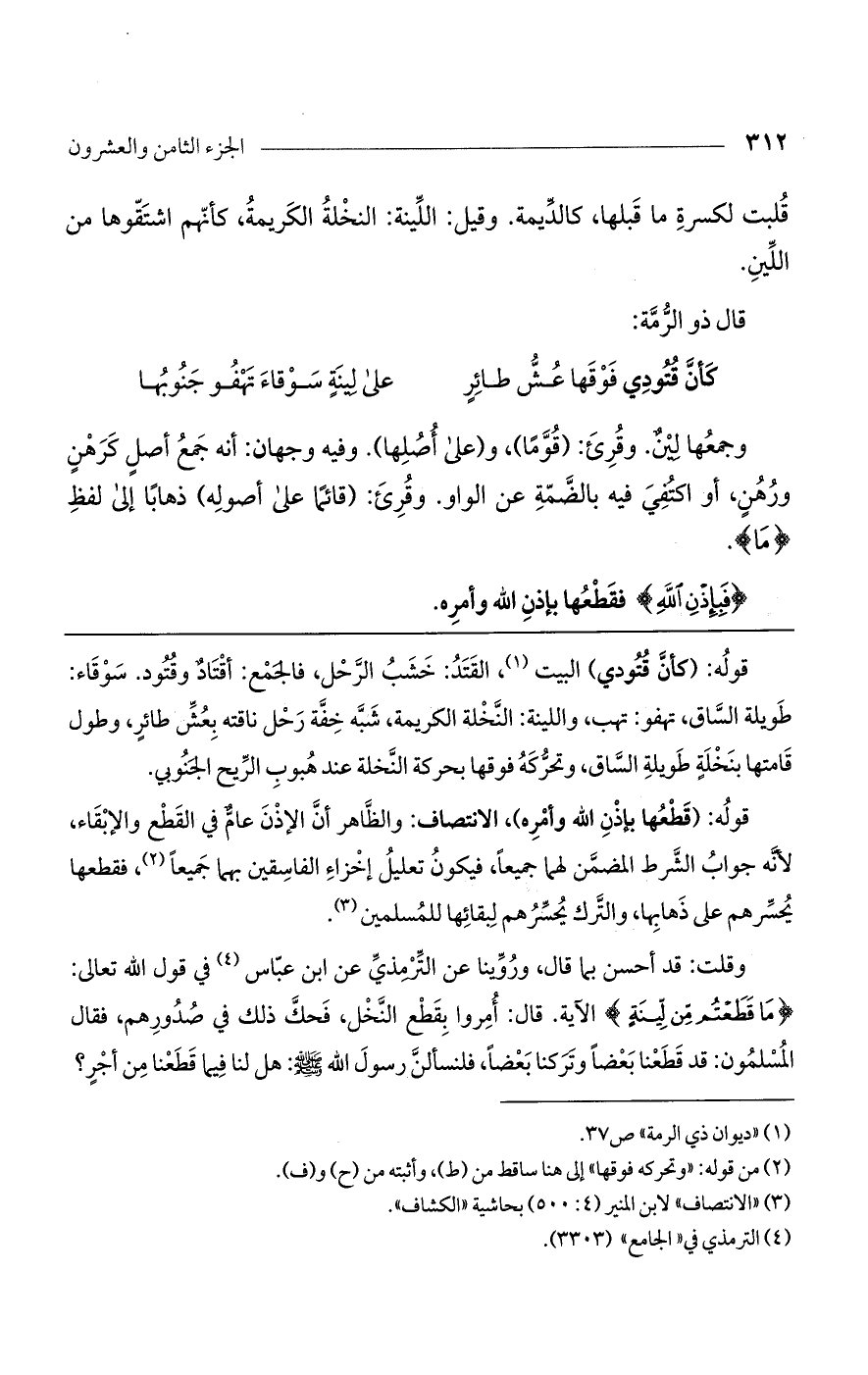 وقلت: قد أحسن بما قال، وروينا عن الترمذي عن ابن عباس في قول الله تعالى: {مَا قَطَعْتُم مِّن لِّينَةٍ} الآية. قال: أمروا بقطع النخل، فحك ذلك في صدورهم، فقال المسلمون: قد قطعنا بعضًا وتركنا بعضًا، فلنسألن رسول الله صلى الله عليه وسلم: هل لنا فيما قطعنا من أجر؟