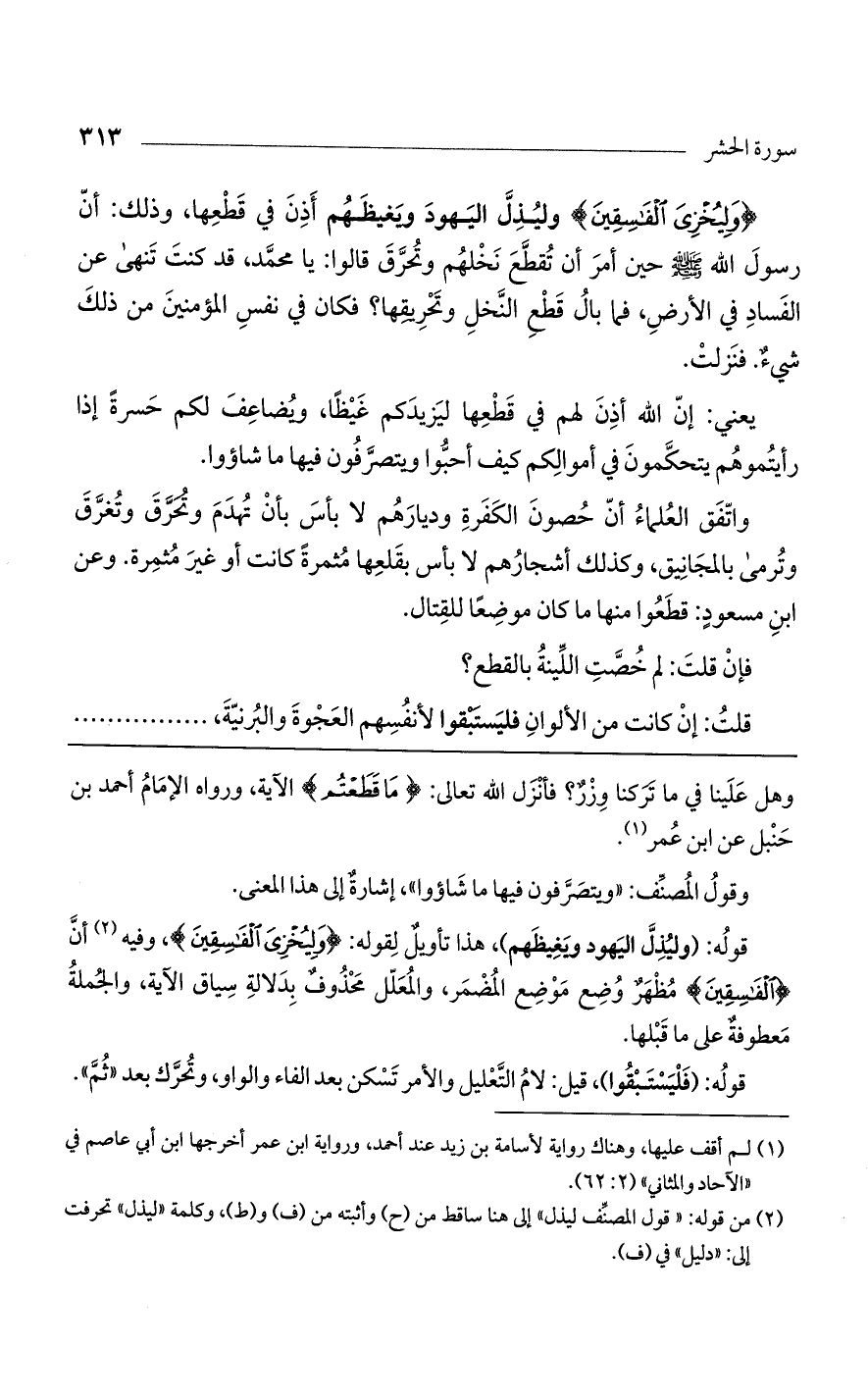{ولِيُخْزِيَ الفَاسِقِينَ} وليذل اليهود ويغيظهم أذن في قطعها، وذلك: أن رسول الله صلى الله عليه وسلم حين أمر أن تقطع نخلهم وتحرق قالوا: يا محمد، قد كنت تنهى عن الفساد في الأرض، فما بال قطع النخل وتحريقها؟ فكان في نفس المؤمنين من ذلك شيء. فنزلت.
