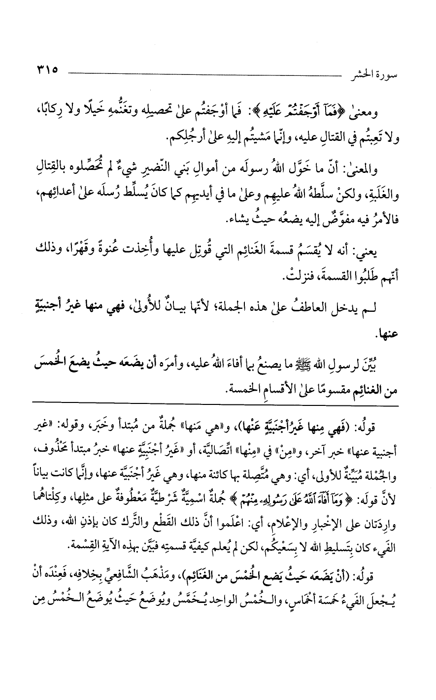 قوله: (فهي منها غير أجنبية عنها)، و"هي منها" جملة من مبتدأ وخبر، وقوله: "غير أجنبية عنها" خبر آخر، و"من" في "منها" اتصالية، أو "غير أجنبية عنها" خبر مبتدأ محذوف، والجملة مبنية للأولى، أي: وهي متصلة بها كائنة منها، وهي غير أجنبية عنها، وإنما كانت بياننًا لأن قوله: {ومَا أَفَاءَ اللَّهُ عَلَى رَسُولِهِ مِنْهُمْ} جملة اسمية شرطية معطوفة على مثلها، وكلتاهما واردتان على الإخبار والإعلام، أي: اعملوا أن ذلك القطع والترك كان بإذن الله، وذلك الفيء كان بتسليط الله لا بسعيكم، لكن لم يعلم كيفية قسمته فبين بهذه الآية القسمة.
