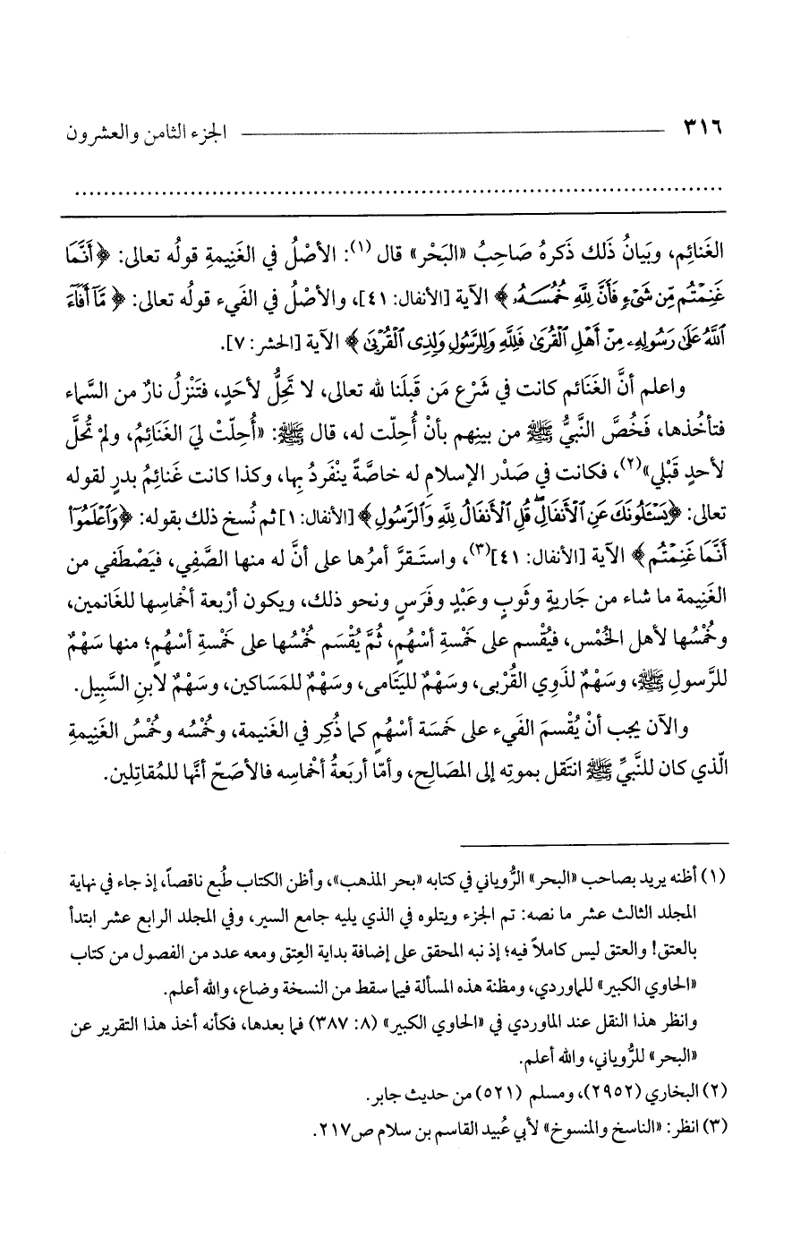 الغنائم، وبيان ذلك ذكره صاحب "البحر" قال: الأصل في الغنيمة قوله تعالى: {أَنَّمَا غَنِمْتُمْ مِنْ شَيْءٍ فَأَنَّ لِلَّهِ خُمُسَهُ} الآية [الأنفال: 41]، والأصل في الفيء قوله تعالى: {مَا أَفَاءَ اللَّهُ عَلَى رَسُولِهِ مِنْ أَهْلِ القُرَى فَلِلَّهِ ولِلرَّسُولِ ولِذِي القُرْبَى} الآية [الحشر: 7].