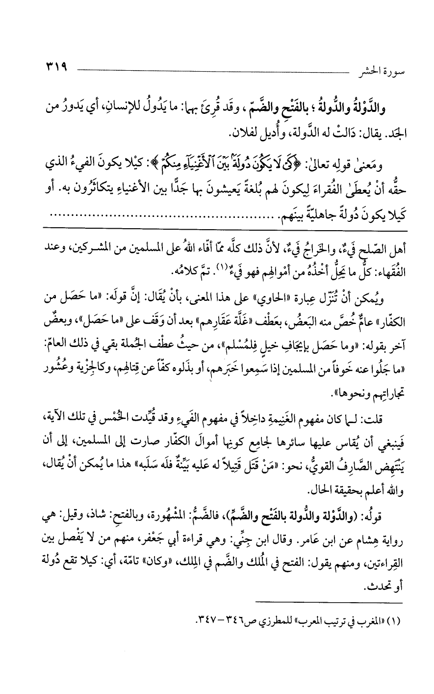 ومعنى قوله تعالى: {كَيْ لا يَكُونَ دُولَةً بَيْنَ الأَغْنِيَاءِ مِنكُمْ}: كيلا يكون الفيء الذي حقه أن يعطى الفقراء ليكون لهم بلغة يعيشون بها جدا بين الأغنياء يتكاثرون به. أو كيلا يكون دولة جاهلية بينهم ...