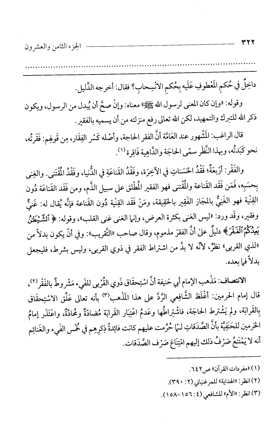 والفقر: أربعة؛ فقد الحسنات في الآخرة، وفقد القناعة في الدنيا، وفقد المقتنى. والغني بحسبه، فمن فقد القناعة والمقتنى فهو الفقير المطلق على سبيل الذم، ومن فقد القناعة دون القنية فهو الغني بالمجاز الفقير بالحقيقة، ومن فقد القنية دون القناعة فإنه يقال له: غني وفقير، وقد ورد: "ليس الغنى بكثرة العرض، وإنما الغنى غنى القلب"، وقوله: {الشَّيْطَانُ يَعِدُكُمُ الْفَقْرَ} دليل على أن الفقر مذموم، وقال صاحب "التقريب": وفي أن يكون بدلًا من "لذي القربى" نظر، لأنه لابد من اشتراط الفقر في ذوي القربى، وليس بشرط، فليجعل بدلًا فما بعده.