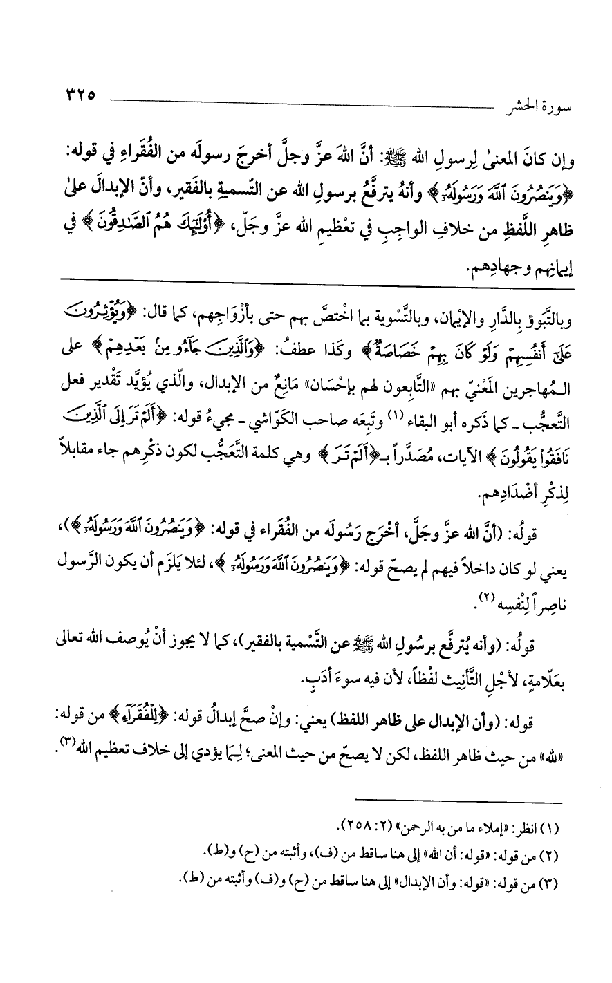 وإن كان المعنى لرسول الله صلى الله عليه وسلم: أن الله عز وجل أخرج رسوله من الفقراء في قوله: {ويَنصُرُونَ اللَّهَ ورَسُولَهُ} وأنه يترفع برسول الله عن التسمية بالفقير، وأن الإبدال على ظاهر اللفظ من خلاف الواجب في تعظيم الله عز وجل، {أُوْلَئِكَ هُمُ الصَّادِقُونَ} في إيمانهم وجهادهم.