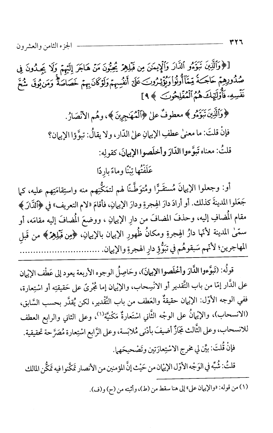 قوله: (تبوءوا الدار وأخلصوا الإيمان)، وحاصل الوجوه الأربعة يعود إلى عطف الإيمان على الدار إما من باب التقدير أو الانسحاب، والإيمان إما مجرى على حقيقته أو استعارة، ففي الوجه الأول: الإيمان حقيقة والعطف من باب التقدير، لكن يقدر بحسب السابق، (الانسحاب)، والإيمان على الوجه الثاني استعارة مكنية، وعلى الثاني والرابع العطف للانسحاب، وعلى الثالث مجاز أضيف بأدنى ملابسة، وعلى الرابع استعارة مصرحة تحقيقية.
