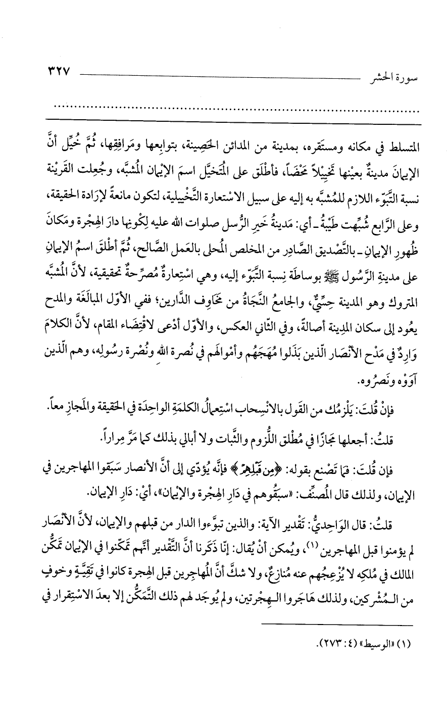 المتسلط في مكانه ومستقره، بمدينة من المدائن الحصينة، بتوابعها ومرافقه، ثم خيل أن الإيمان بعينها تخييلًا محضًا، فأطلق على المتخيل اسم الإيمان المشبه، وجعلت القرينة نسبة التبوء اللازم للمشبه به إليه على سبيل الاستعارة التخييلية، لتكون مانعة لإرادة الحقيقة، وعلى الرابع شبهت طيبة- أي: مدينة خير الرسل صلوات الله عليه لكونها دار الهجرة ومكان ظهور الإيمان- بالتصديق الصادر من المخلص المحلى بالعمل الصالح، ثم أطلق اسم الإيمان على مدينة الرسول صلى الله عليه وسلم بوساطة نسبة التبوء إليه، وهي استعارة مصرحة تحقيقية، لأن المشبه المتروك وهو المدينة حسي، والجامع النجاة من مخاوف الدارين؛ ففي الأول المبالغة والمدح يعود إلى سكان المدينة أصالة، وفي الثاني العكس، والأول أدعى لاقتضاء المقام؛ لأن الكلام وارد في مدح الأنصار الذين بذلوا مهجهم وأموالهم في نصرة الله ونصرة رسوله، وهم الذين آووه ونصروه.
