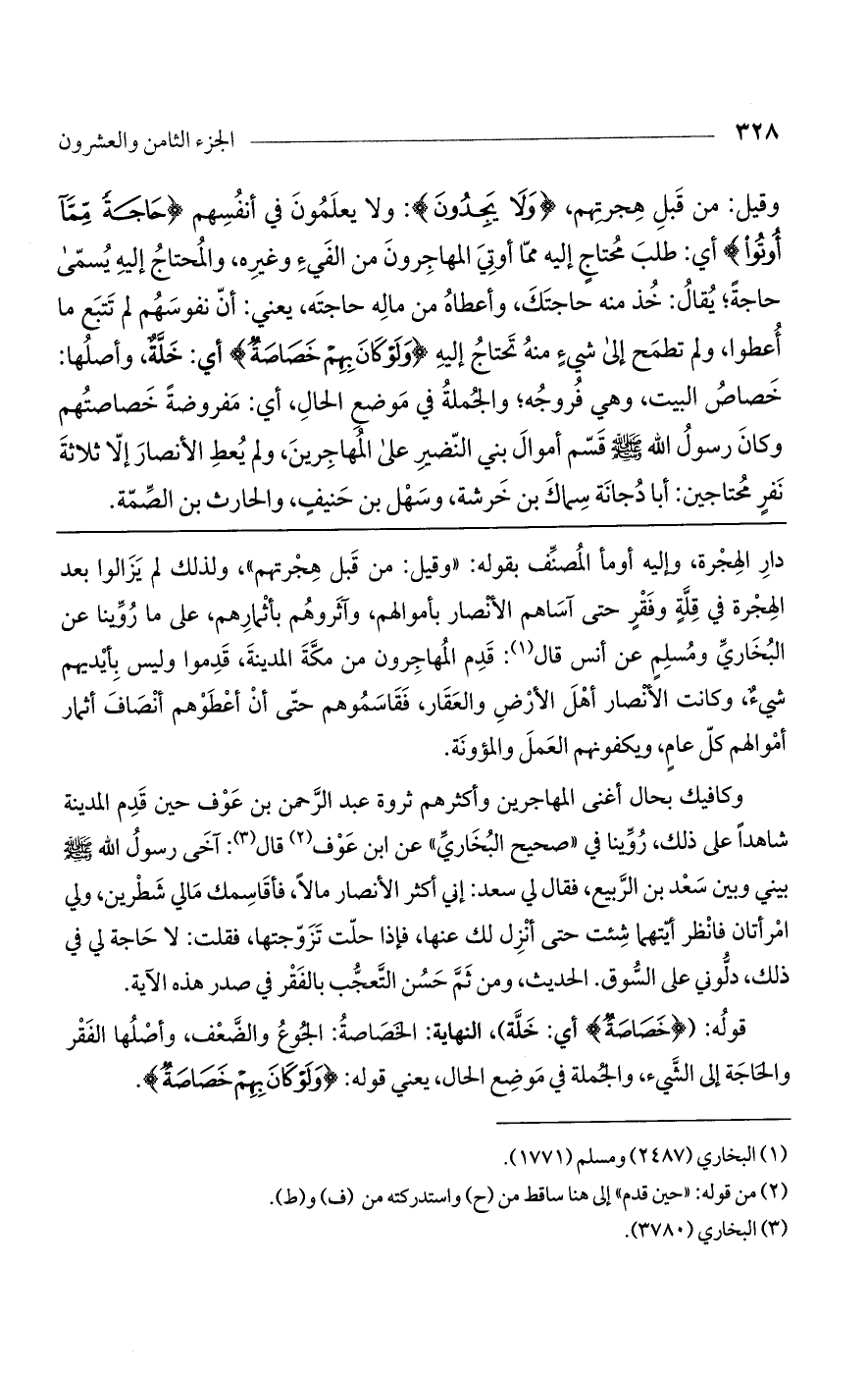 وكافيك بحال أغنى المهاجرين وأكثرهم ثروة عبد الرحمن بن عوف حين قدم المدينة شاهدًا على ذلك، روينا في "صحيح البخاري" عن ابن عوف قال: آخر رسول الله صلى الله عليه وسلم بيني وبين سعد بن الربيع، فقال لي سعد: إني أكثر الأنصار مالًا، فأقاسمك مالي شرطين، ولي امرأتان فانظر أيتهما شئت حتى أنزل لك عنها، فإذا حلت تزوجتها، فقلت: لا حاجة لي في ذلك، دلوني عن السوق. الحديث، ومن ثم حسن التعجب بالفقر في صدر هذه الآية.