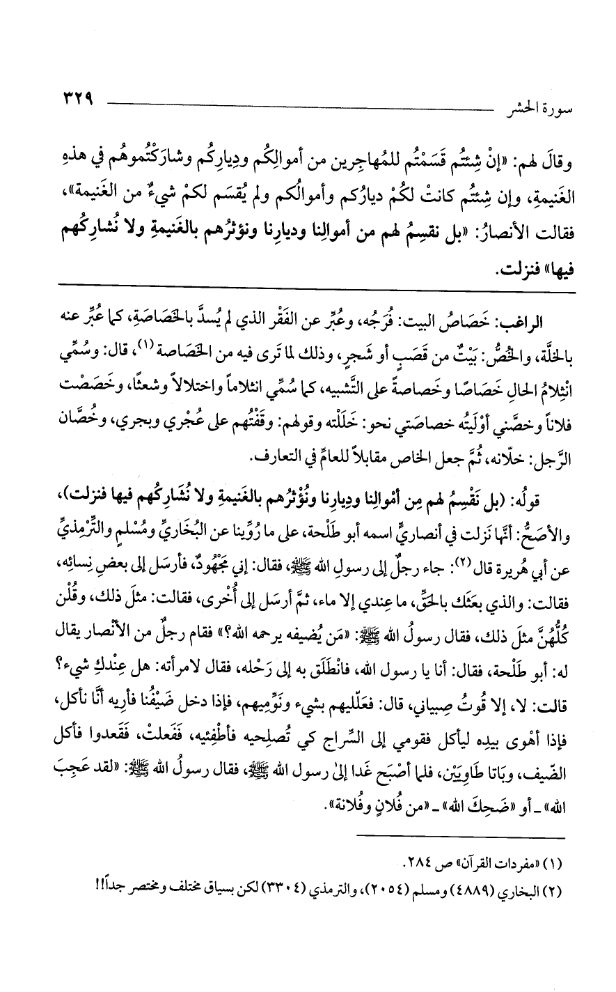 قوله: (بل نقسم لهم من أموالنا وديارنا ونؤثرهم بالغنيمة ولا نشاركهم فيها فنزلت)، والأصح: أنها نزلت في أنصاري اسمه أبو طلحة، على ما روينا عن البخاري مسلم والترمذي عن أبي هريرة قال: جاء رجل إلى رسول الله صلى الله عليه وسلم، فقال: إني مجهود، فأرسل إلى بعض نسائه، فقالت: والذي بعثك بالحق، ما عندي غلا ماء، ثم أرسل إلى أخرى، فقالت: مثل ذلك: وقلن كلهن مثل ذلك، فقال رسول الله صلى الله عليه وسلم: "من يضيفه يرحمه الله؟ " فقام رجل من الأنصار يقال له: أبو طلحة، فقال: أنا يا رسول الله، فانطلق به إلى رحله، فقال لامرأته: هل عندك شيء؟ قالت: لا، إلا قوت صبياني، قال: فعليهم بشيء ونوميهم، فإذا دخل ضيفنا فأريه أنا نأكل، فإذا أهوى بيده ليأكل فقومي إلى السراج كي تصلحيه فأطفئيه، ففعلت، فقعدوا فأكل الضيف، وباتا طاويين، فلما أصبح غدا إلى رسول الله صلى الله عليه وسلم، فقال رسول الله صلى الله عليه وسلم: "لقد عجب الله"_ أو "ضحك الله"_ "من فلان وفلانة".
