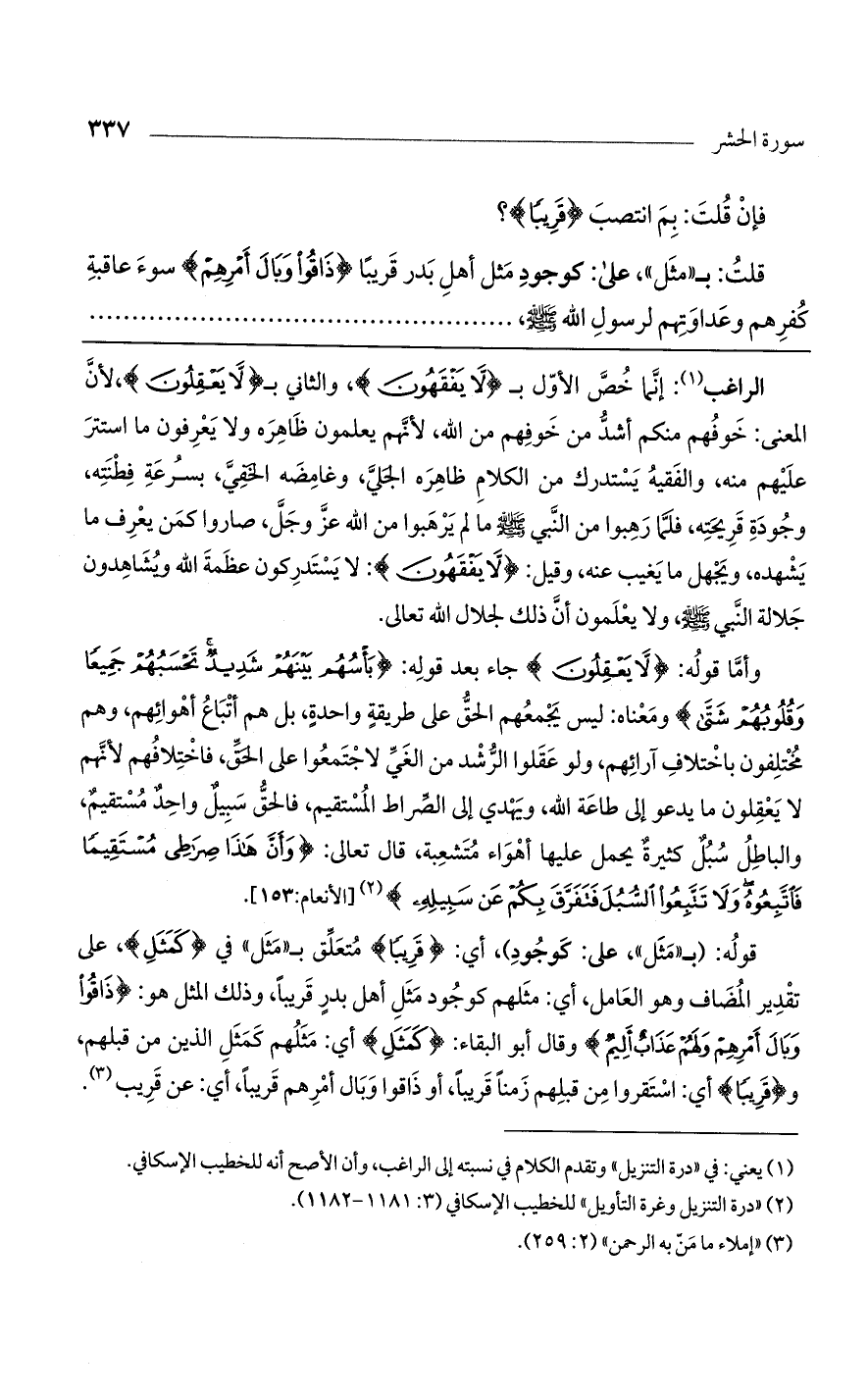 الراغب: إنما خص الأول بـ {لا يَفْقَهُونَ}، والثاني بـ {لاَّ يَعْقِلُونَ}، لأن المعنى: خوفكم منكم أشد من خوفهم من الله، لأنهم يعلمون ظاهره ولا يعرفون ما استتر عليهم منه، والفقيه يستدرك من الكلام ظاهره الجلي، وغامضه الخفي، بسرعة فطنته، وجوده قريحته، فلما رهبوا من النبي صلى الله عليه وسلم ما لم يرهبوا من الله عز وجل، صاروا كمن يعرف ما يشهده، ويجهل ما يغيب عنه، وقيل: {لا يَفْقَهُونَ}: لا يستدركون عظمة الله ويشاهدون جلالة النبي صلى الله عليه وسلم، ولا يعلمون أن ذلك لجلال الله تعالى.