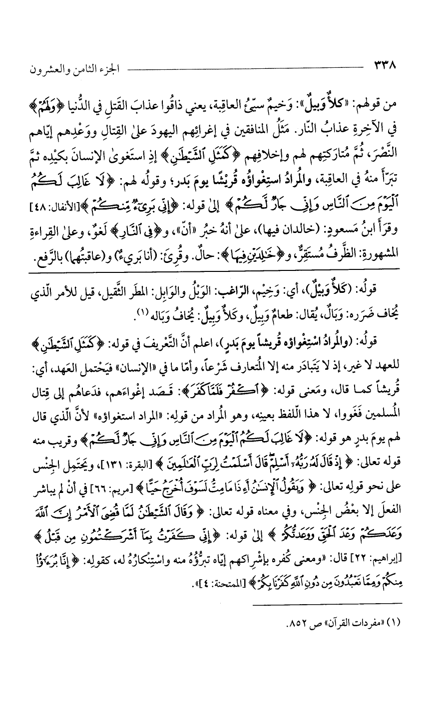 قوله: (والمراد استغواؤه قريشًا يوم بدر)، اعلم أن التعريف في قوله: {كَمَثَلِ الشَّيْطَانِ} للعهد لا غير، إذ لا يتبادر منه إلا المتعارف شرعًا، وأما ما في "الإنسان" فيحتمل العهد، أي: قريشًا كما قال، ومعنى قوله: {اكْفُرْ فَلَمَّا كَفَرَ}: قصد إغواءهم، فدعاهم إلى قتال المسلمين فغووا، لا هذا اللفظ بعينه، وهو المراد من قوله: "المراد استغواؤه" لأن الذي قال لهم يوم بدر هو قوله: {لَا غَالِبَ لَكُمُ الْيَوْمَ مِنَ النَّاسِ وَإِنِّي جَارٌ لَكُمْ} وقريب منه قوله تعالى: {إِذْ قَالَ لَهُ رَبُّهُ أَسْلِمْ قَالَ أَسْلَمْتُ لِرَبِّ الْعَالَمِينَ} [البقرة: 131]، ويحتمل الجنس على نحو قوله تعالى: {وَيَقُولُ الْإِنْسَانُ أَئِذَا مَا مِتُّ لَسَوْفَ أُخْرَجُ حَيًّا} [مريم: 66] في أن لم يباشر الفعل إلا بعض الجنس، وفي معناه قوله تعالى: {وَقَالَ الشَّيْطَانُ لَمَّا قُضِيَ الْأَمْرُ إِنَّ اللَّهَ وَعَدَكُمْ وَعْدَ الْحَقِّ وَوَعَدْتُكُمْ} إلى قوله: {إِنِّي كَفَرْتُ بِمَا أَشْرَكْتُمُونِ مِنْ قَبْلُ} [إبراهيم: 22] قال: "ومعنى كفره بإشراكهم إياه تبرؤه منه واستنكاره له، كقوله: {إِنَّا بُرَآَءُ مِنْكُمْ وَمِمَّا تَعْبُدُونَ مِنْ دُونِ اللَّهِ كَفَرْنَا بِكُمْ} [الممتحنة: 4] ".
