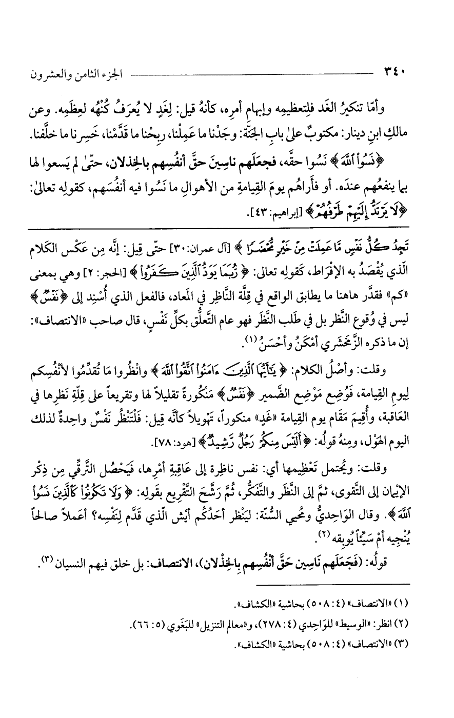 تَجِدُ كُلُّ نَفْسٍ مَا عَمِلَتْ مِنْ خَيْرٍ مُحْضَرًا} [آل عمران: 30] حتى قيل: إنه من عكس الكلام الذي يقصد به الإفراط، كقوله تعالى: {رُبَمَا يَوَدُّ الَّذِينَ كَفَرُوا} [الحجر: 2] وهي بمعنى "كم" فقدر هاهنا ما يطابق الواقع في قلة الناظر في المعاد، فالفعل الذي أسند إلى {نَفْسٌ} ليس في وقوع النظر بل في طلب النظر فهو عام التعلق بكل نفس، قال صاحب "الانتصاف": إن ما ذكره الزمخشري أمكن وأحسن.