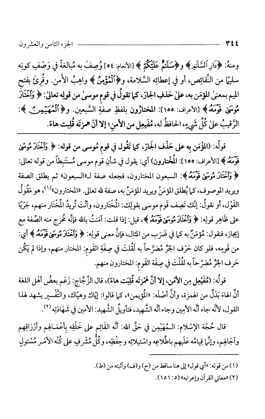 قوله: (المؤمن به على حذف الجار، كما تقول في قوم موسى من قوله: {وَاخْتَارَ مُوسَى قَوْمَهُ} [الأعراف: 155]: المختارون) أي: يقول في شأن قوم موسى مستنبطًا من قوله تعالى: {وَاخْتَارَ مُوسَى قَوْمَهُ}: السبعون المختارون، فجعله صفة لـ"السبعون" ثم يطلق الصفة ويريد الموصوف، كما يطلق المؤمن ويريد المؤمن به، صفة لله تعالى. "المختارون"، هو مقول القول، أو نقول: إنك تصف قوم موسى بقولك: المختارون، وأنت تريد المختار منهم، جريًا على ظاهر قوله: {وَاخْتَارَ مُوسَى قَوْمَهُ}، قيل: إذا قلت: آمنت بالله فإنه مخرج منه الصفة مع إيجاز، فنقول: مؤمن به كما في ضرب من المثال، فإن معنى قوله: {وَاخْتَارَ مُوسَى قَوْمَهُ} أي: من قومه، فلو كان حرف الجر مصرحًا به لقلت في صفة القوم: المختار منهم، وإذا لم يكن حرف الجر مصرحًا به لقلت في صفة القوم: المختارون منهم.