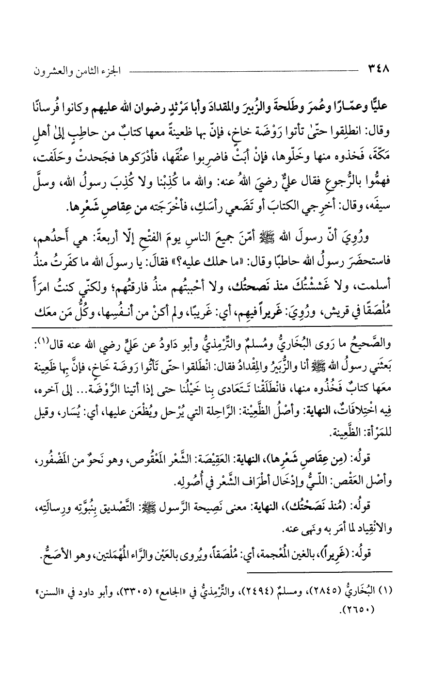 والصحيح ما روى البخاري ومسلم والترمذي وأبو داود عن علي رضي الله عنه قال: بعثني رسول الله صلى الله عليه وسلم أنا والزبير والمقداد فقال: انطلقوا حتى تأتوا روضة خاخ، فإن بها ظعينة معها كتاب فخذوه منها، فانطلقنا تتعادى بنا خيلنا حتى إذا أتينا الروضة ... إلى آخره، فيه اختلافات، النهاية: وأصل الظعينة: الراحلة التي يرحل ويظعن عليها، أي: يسار، وقيل للمرأة: الظعينة.