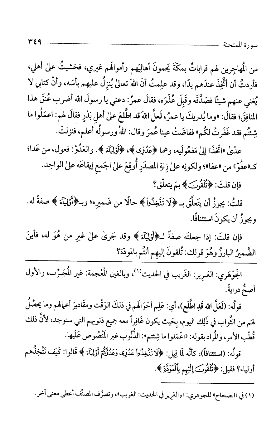 من المهاجرين لهم قرابات بمكة يحمون أهاليهم وأموالهم غيري، فخشيت على أهلي، فأردت أن أتخذ عندهم يدًا، وقد علمت أن الله تعالى ينزل عليهم بأسه، وأن كتابي لا يغني عنهم شيئًا فصدقه وقبل عذره، فقال عمر: دعني يا رسول الله أضرب عنق هذا المنافق؛ فقال: "وما يدريك يا عمر، لعل الله قد اطلع على أهل بدر فقال لهم: اعملوا ما شئتم فقد غفرت لكم" ففاضت عينا عمر وقال: الله ورسوله أعلم، فنزلت.