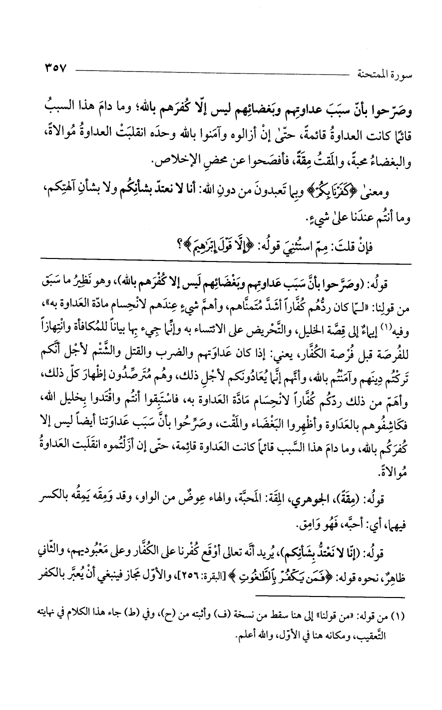 قوله: (وصرحوا بأن سبب عداوتهم وبغضائهم ليس إلا بكفرهم بالله)، وهو نظير ما سبق من قولنا: "لما كان ردهم كفارًا أشد متمناهم، وأهم شيء عندهم لانحسام مادة العداوة به"، وفيه إيماء إلى قصة الخليل، والتحريض على الائتساء به وإنما جيء بها بيانًا للمكافأة وانتهازًا للفرصة قبل فرصة الكفار، يعني: إذا كان عداوتهم والضرب والقتل والشتم لأجل أنكم تركتم دينهم وآمنتم بالله، وأنهم إنما يعادونكم لأجل ذلك، وهم مترصدون إظهار كل ذلك، وأهم من ذلك ردكم كفارًا لانحسام مادة العداوة به، فاستبقوا أنتم واقتدوا بخليل الله، فكاشفوهم بالعداوة وأظهروا البغضاء والمقت، وصرحوا بأن سبب عداوتنا أيضًا ليس إلا كفركم بالله، وما دام هذا السبب قائمًا كانت العداوة قائمة، حتى إن أزلتموه انقلبت العداوة موالاة.