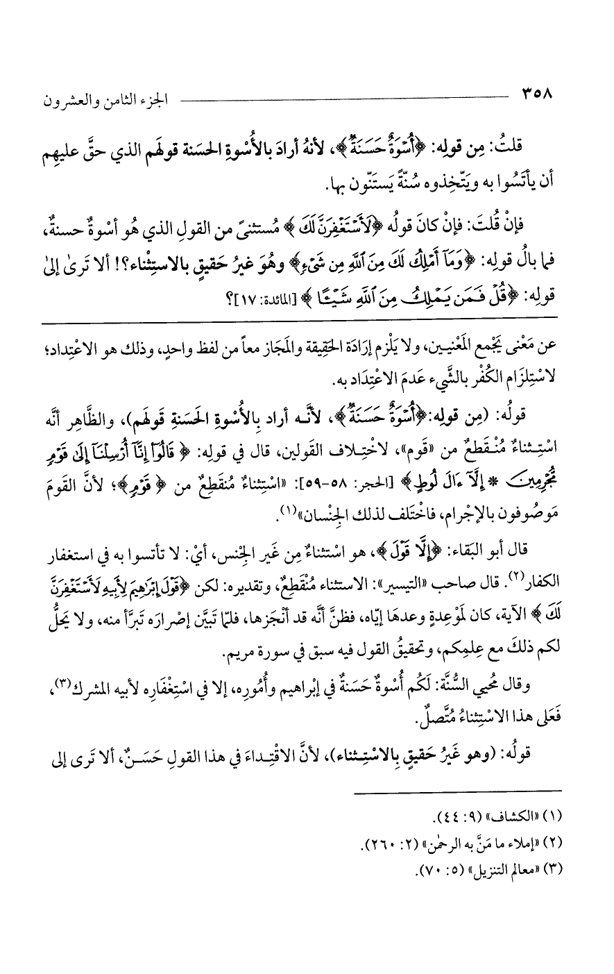 فإن قلت: فإن كان قوله {لأَسْتَغْفِرَنَّ لَكَ} مستثنىً من القول الذي هو أسوة حسنة، فما بال قوله: {ومَا أَمْلِكُ لَكَ مِنَ اللَّهِ مِن شَيْءٍ} وهو غير حقيق بالاستثناء؟ ! ألا ترى إلى قوله: {قُلْ فَمَنْ يَمْلِكُ مِنَ اللَّهِ شَيْئًا} [المائدة: 17]؟