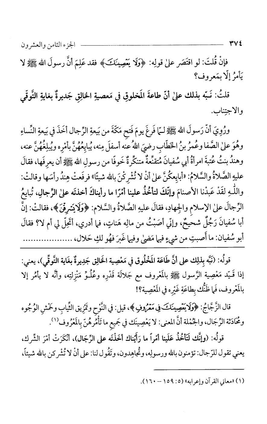 قال الزجاج: {ولا يَعْصِينَكَ فِي مَعْرُوفٍ}، قيل: في النوح وتمزيق الثياب وخمس الوجوه ومحادثة الرجال، والجملة أن المعنى: لا يعصينك في جميع ما تأمرهن بالمعروف.