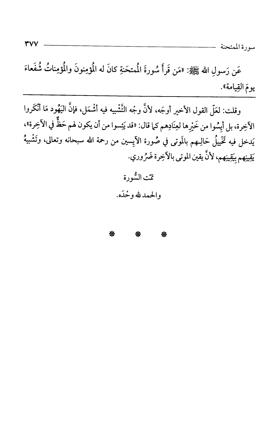 عن رسول الله صلى الله عليه وسلم: " من قرأ سورة الممتحنة كان له المؤمنون والمؤمنات شفعاء يوم القيامة".