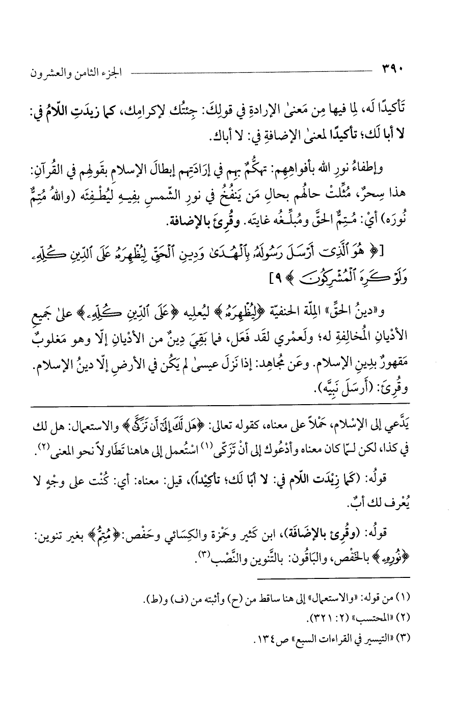 وإطفاء نور الله بأفواههم: تهكم بهم في إرادتهم إبطال الإسلام بقولهم في القرآن: هذا سحر، مثلت حالهم بحال من ينفخ في نور الشمس بفيه ليطفئه (والله متم نوره) أي: متم الحق ومبلغه غايته. وقرئ بالإضافة.