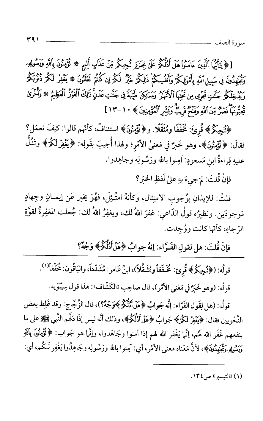 قوله: (هل لقول الفراء: إنه جواب {هَلْ أَدُلُّكُمْ} وجه؟ )، قال الزجاج: وقد غلط بعض النحويين فقال: {يَغْفِرْ لَكُمْ} جواب {هَلْ أَدُلُّكُمْ}، وذلك أنه ليس إذا دلهم النبي صلى الله عليه وسلم على ما ينفعهم غفر الله لهم، إنما يغفر الله لهم إذا آمنوا وجاهدوا، وإنما هو جواب: {تُؤْمِنُونَ بِاللَّهِ ورَسُولِهِ وتُجَاهِدُونَ}، لأن معناه معنى الأمر، أي: آمنوا بالله ورسوله وجاهدوا يغفر لكم، أي: