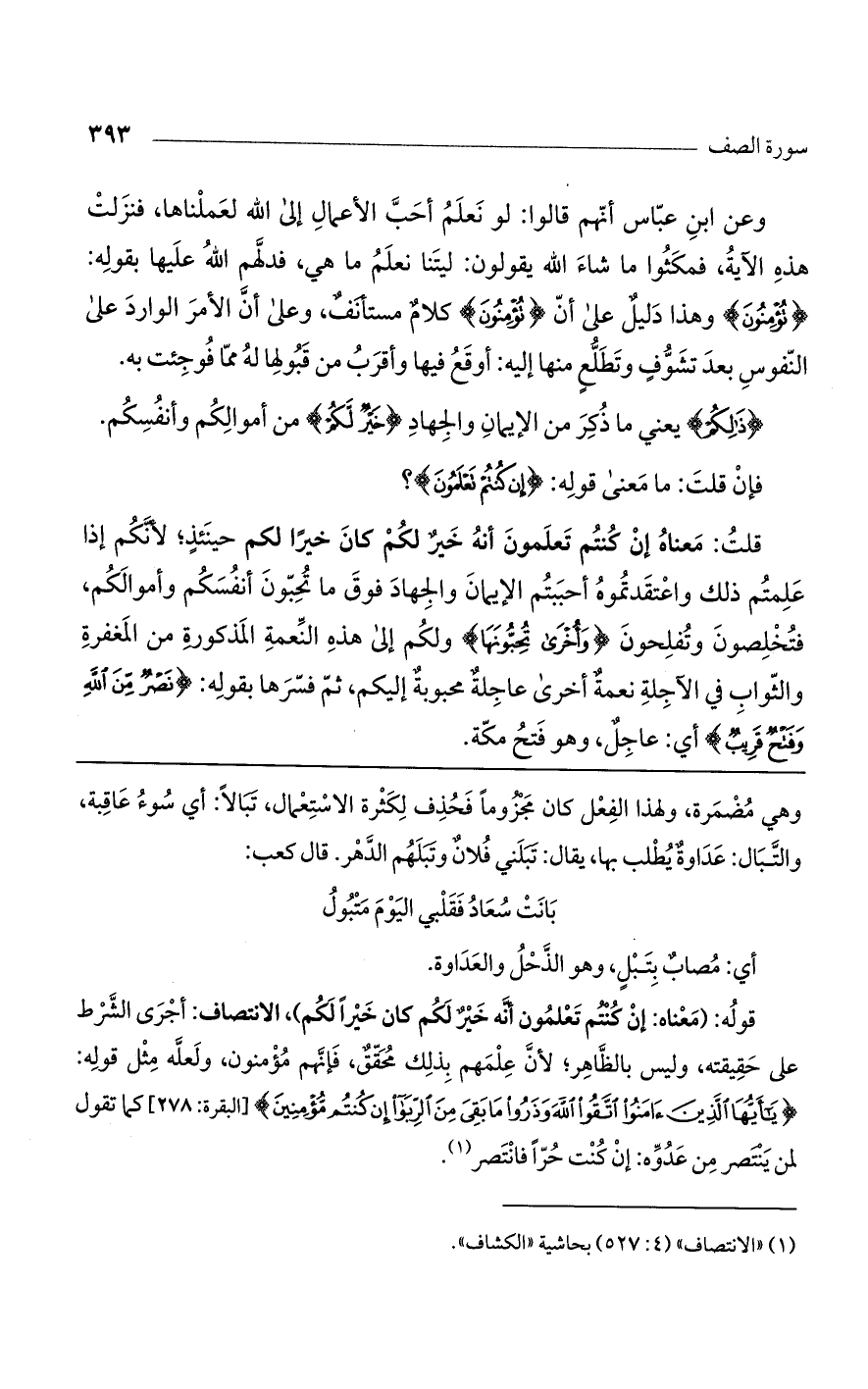 قلت: معناه إن كنتم تعلمون أنه خير لكم كان خيرًا لكم حينئذ لأنكم إذا علمتم ذلك واعتقدتموه أحببتم الإيمان والجهاد فوق ما تحبون أنفسكم وأموالكم، فتخلصون وتفلحون {وأُخْرَى تُحِبُّونَهَا} ولكم إلى هذه النعمة المذكورة من المغفرة والثواب في الآجلة نعمة أخرى عاجلة محبوبة إليكم، ثم فسرها بقوله: {نَصْرٌ مِّنَ اللَّهِ وفَتْحٌ قَرِيبٌ} أي: عاجل، وهو فتح مكة.