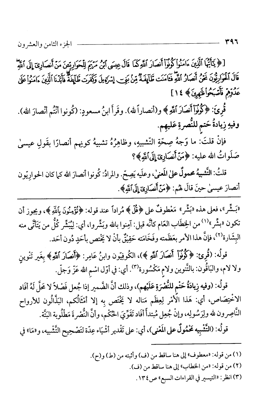 قوله: (قرئ: {كُونُوا أَنصَارَ اللَّهِ})، الكوفيون وابن عامر: {أَنصَارَ اللَّهِ} بغير تنوين ولا لام، والباقون: بالتنوين ولام مكسورة. أي: في أول اسم الله عز وجل.