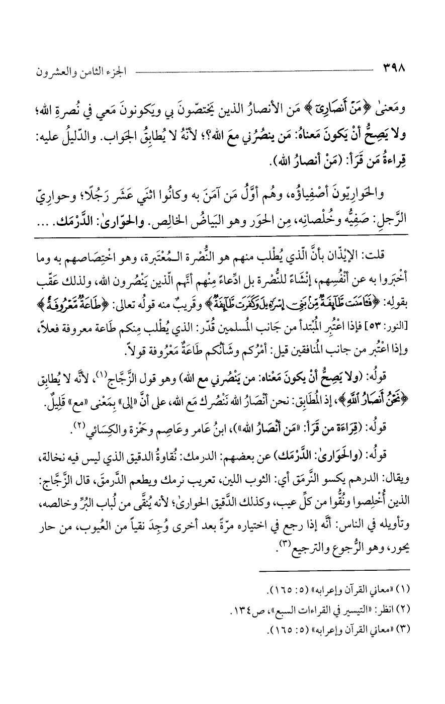 قوله: (قراءة من قرأ: "من أنصار الله")، ابن عامر وعاصم وحمزة والكسائي.