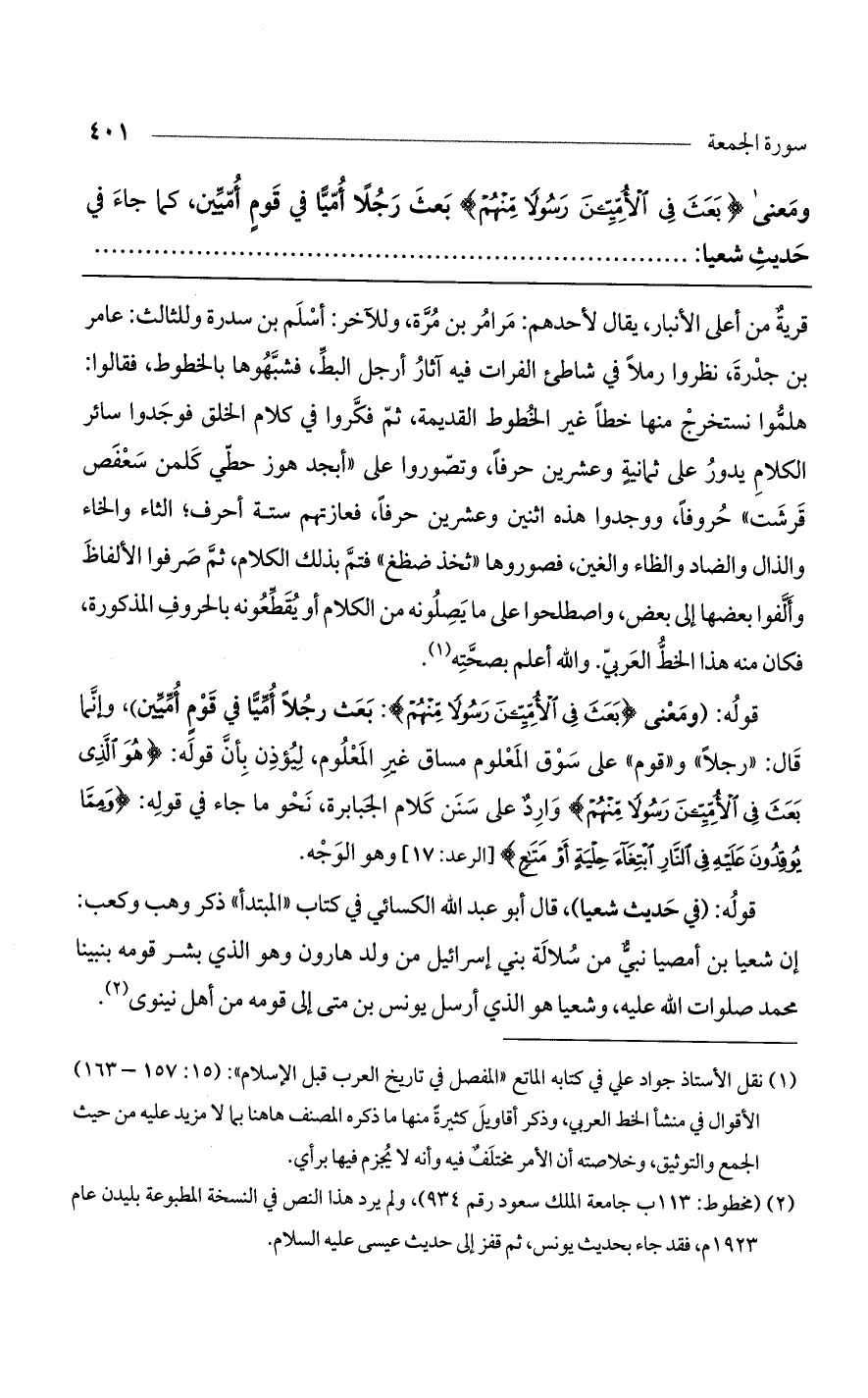 ومعنى {بَعَثَ فِي الأُمِّيِّينَ رَسُولًا مِّنْهُمْ} بعث رجلًا أميًا في قوم أميين، كما جاء في حديث شعيا: