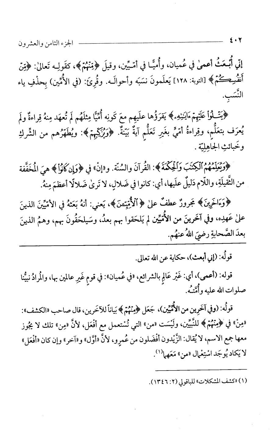 قوله: (وفي آخرين من الأميين)، جعل {مِنْهُمْ} بيانًا للآخرين، قال صاحب "الكشف": "من" في {مِنْهُمْ} للنبيين، وليست "من" التي تستعمل مع أفعل، لأن "من" تلك لا يجوز معها جمع الاسم، لا يقال: الزيدون أفضلون من عمرو، لأن "أول" و"آخر" وإن كان "أفعل" لا يكاد يوجد استعمال "من" معهما.