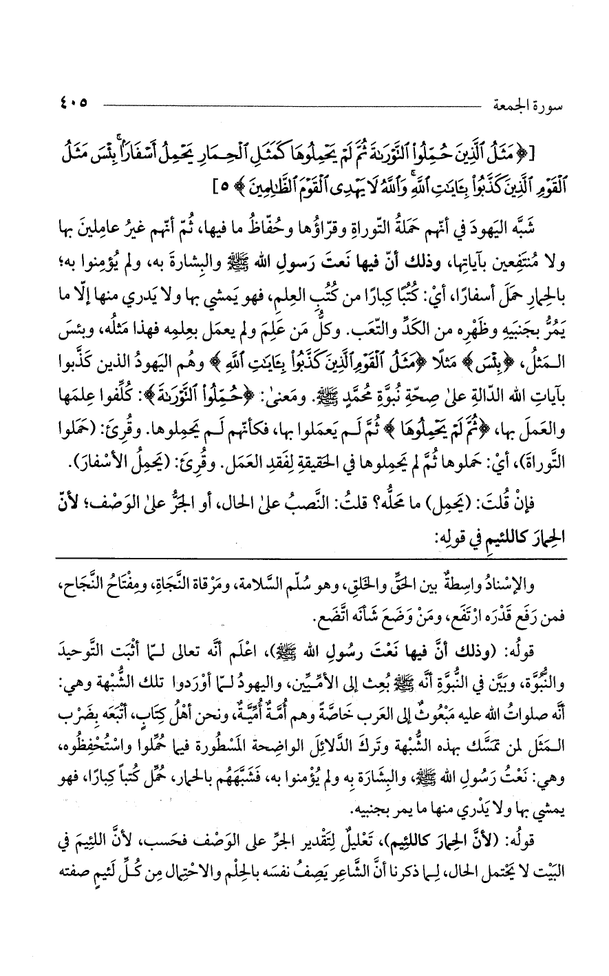 شبه اليهود في أنهم حملة التوراة وقراؤها وحفاظ ما فيها، ثم أنهم غير عاملين بها ولا منتفعين بآياتها، وذلك أن فيها نعت رسول الله صلى الله عليه وسلم والبشارة به، ولم يؤمنوا به؛ بالحمار حمل أسفارًا، أي: كتبًا كبارًا من كتب العلم، فهو يمشي بها ولا يدري منها إلا ما يمر بجنبيه وظهره من الكد والتعب. وكل من علم ولم يعمل بعلمه فهذا مثله، وبئس المثل، {بِئْسَ} مثلًا {مَثَلُ القَوْمِ الَّذِينَ كَذَّبُوا بِآيَاتِ اللَّهِ} وهم اليهود الذين كذبوا بآيات الله الدالة على صحة نبوة محمد صلى الله عليه وسلم. ومعنى: {حُمِّلُوا التَّوْرَاةَ}: كلفوا علمها والعمل بها، {ثُمَّ لَمْ يَحْمِلُوهَا} ثم لم يعملوا بها، فكأنهم لم يحملوها. وقرئ: (حملوا التوراة)، أي: حملوها في الحقيقة لفقد العمل. وقرئ: (يحمل الأسفار).
